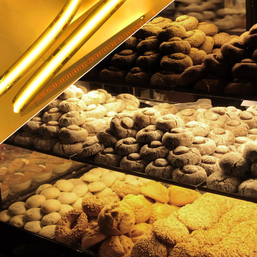 Tira LED con el nuevo Chip COB que ofrece iluminación lineal continua sin puntos. Incorpora cinta adhesiva 3M-térmica de máxima calidad para colocar la tira en cualquier superficie. Especialmente indicada para realzar los alimentos: Pan y repostería