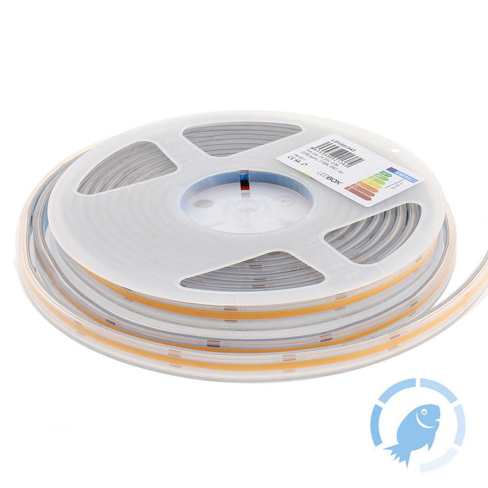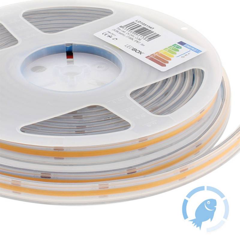 Tira LED con el nuevo Chip COB que ofrece iluminación lineal continua sin puntos. Incorpora cinta adhesiva 3M-térmica de máxima calidad para colocar la tira en cualquier superficie. Especialmente indicada para realzar los alimentos frescos: Pescaderías. Protección contra el agua IP67.