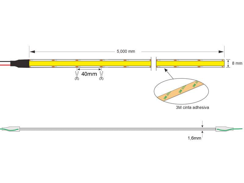 Tira LED con el nuevo Chip COB que ofrece iluminación lineal continua sin puntos. Incorpora cinta adhesiva 3M-300LSE de máxima calidad para colocar la tira en cualquier superficie. Tira de 5 metros con 350 led por metro de alto brillo y un elevado CRI >92 que proporciona una luz espectacular.