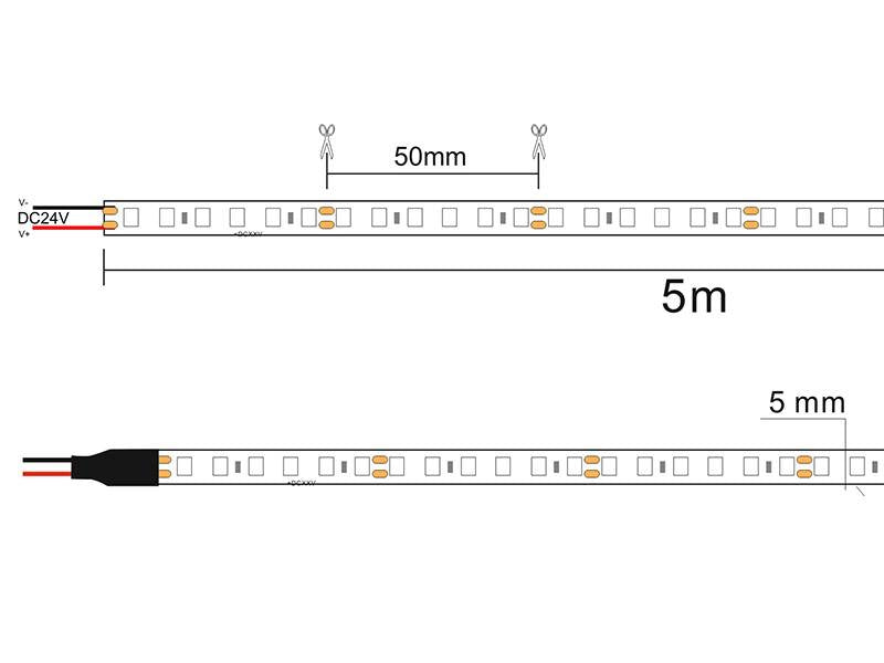 Tira LED Monocolor SMD2835, DC24V, 5m (120Led/m) PCB 5mm, 60W, CRI 90 - IP20, Blanco cálido