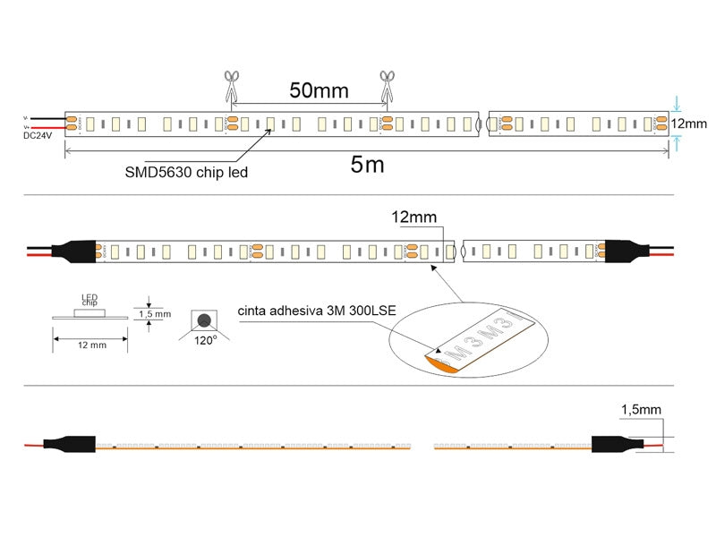 Tira LED con el nuevo Chip Samsung con 120led/metro de alta potencia lumínica SMD5630 y doble PCB de 12mm para una mejor disipación del calor. Incorpora cinta adhesiva 3M 300LSE para colocar la tira en cualquier superficie. Tira de 5 metros.