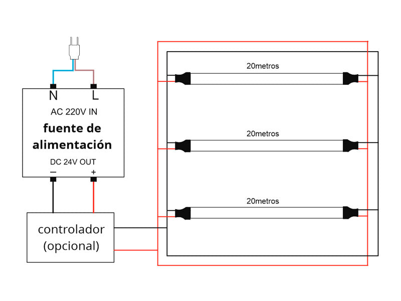 - Hasta 20 metros de tira contínua sin caídas de tensión, misma luminosidad de principio a fin de la tira led.