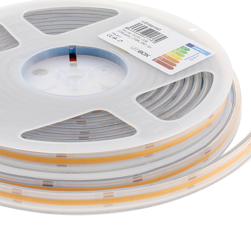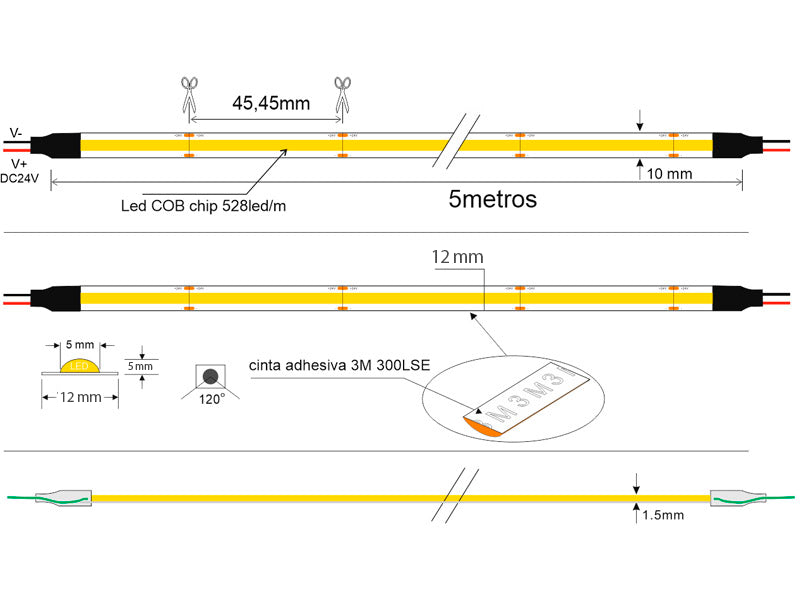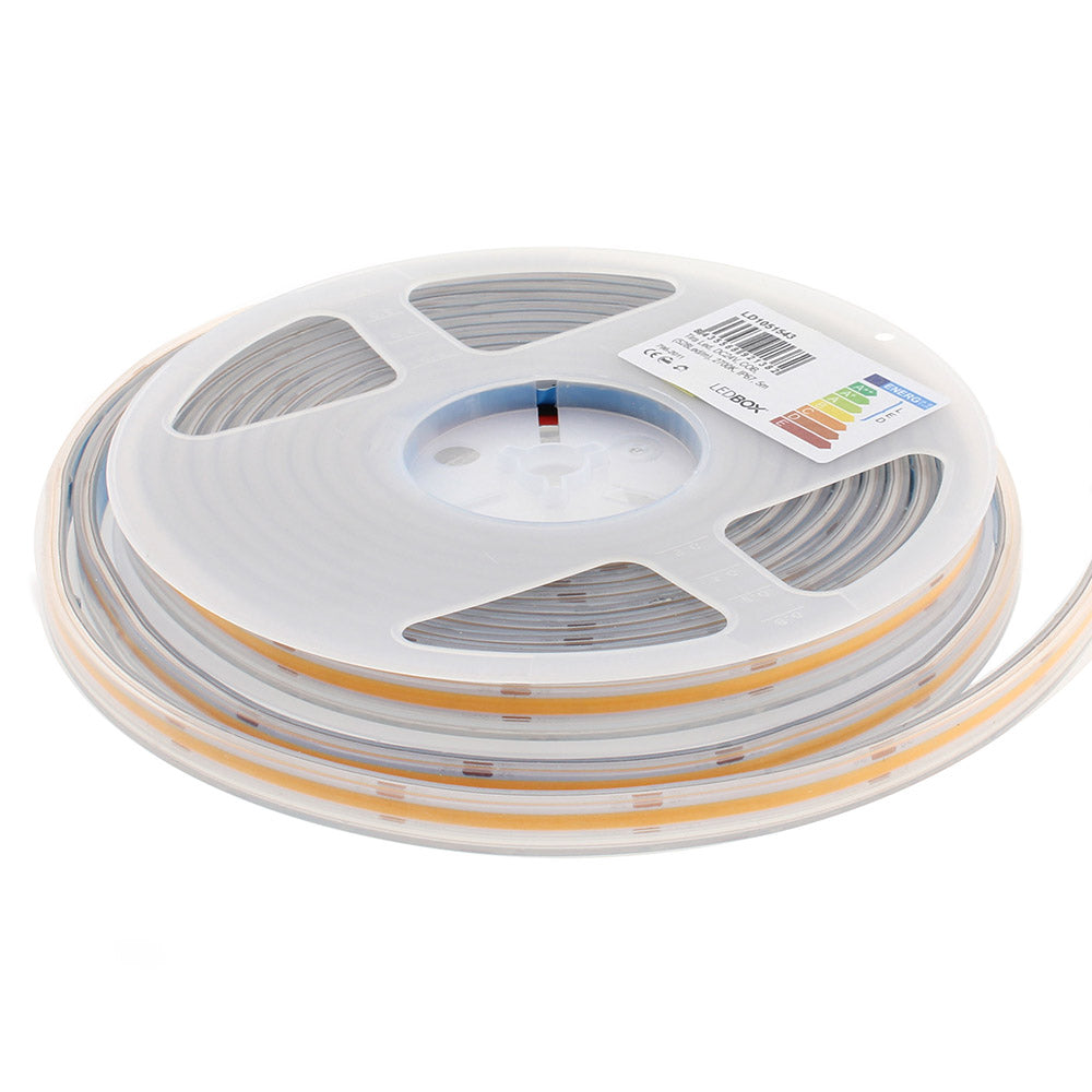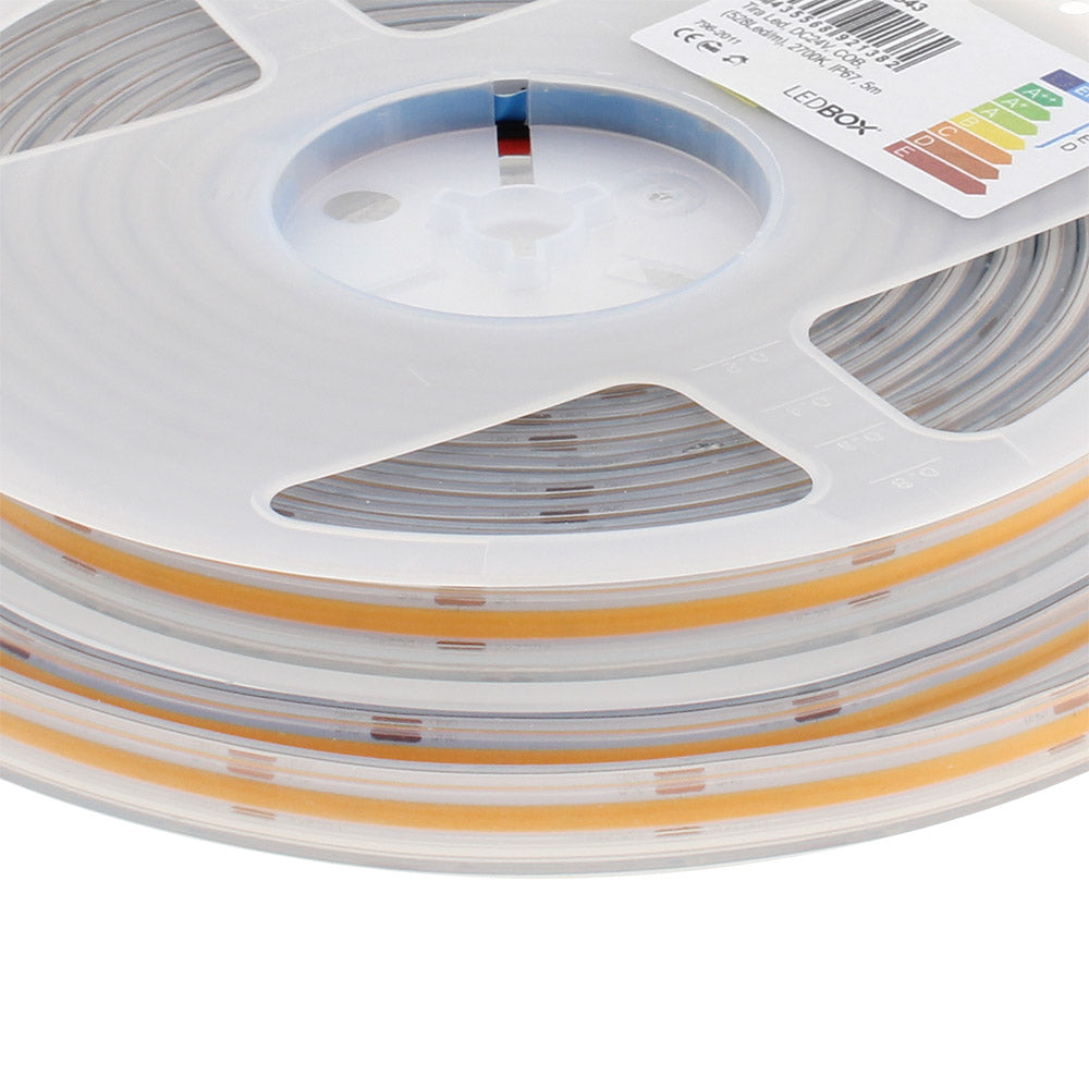 Tira LED con el nuevo Chip Samsung COB que ofrece iluminación lineal continua sin puntos. Incorpora cinta adhesiva 3M-térmica de máxima calidad para colocar la tira en cualquier superficie. Tira de 5 metros con 528 led por metro de alto brillo y un elevado CRI 90 que proporciona una luz espectacular.