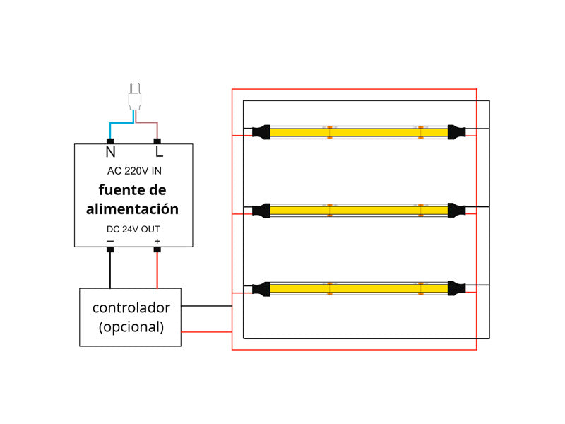 Para la instalación de una tira LED necesitarás de una fuente de alimentación, en el caso de querer unir más de 8 metros de tira LED se recomienda insertar una nueva fuente para no tener caídas de tensión y tener la misma luminosidad en todo el tramo. Además dispones de accesorios para conectar y empalmar tiras LED de forma fácil y rápida.