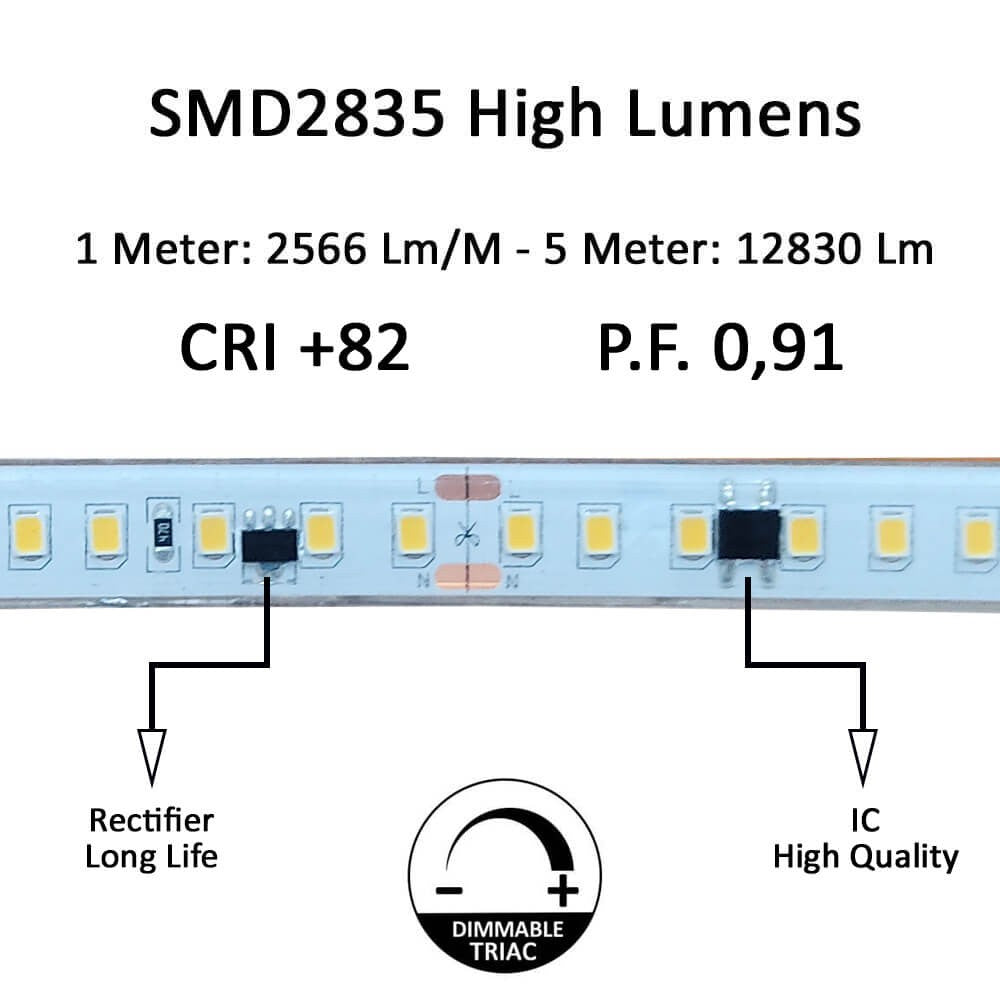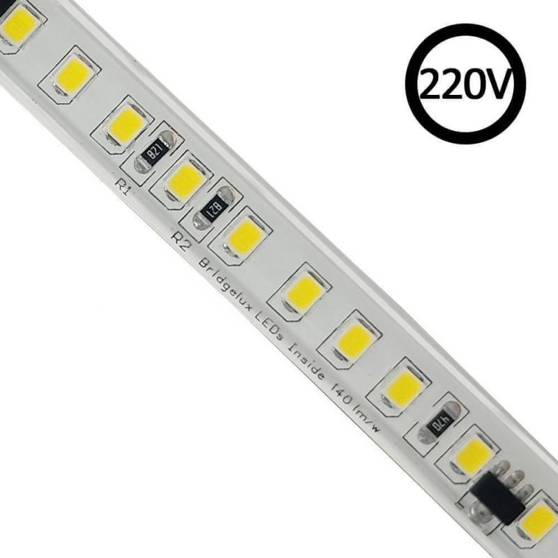 1 metro de tira LED flexible BRIDGELUX SMD2835-DC220V con regulación TRIAC de la más alta calidad para proyectos profesionales. Por su flexibilidad y alta luminosidad es ideal para crear una iluminación de calidad en todo tipo de ambientes, tanto en interiores como en exteriores.