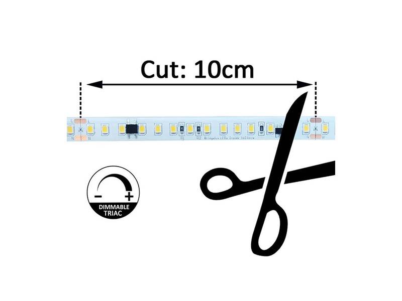 Se pueden cortar cada 10 cm, por lo que las tiras LED a 220V reducen significativamente la probabilidad de fallos, usan circuitos serie/paralelo, si se daña una zona (cada zona 10cm) no afecta a las demás.