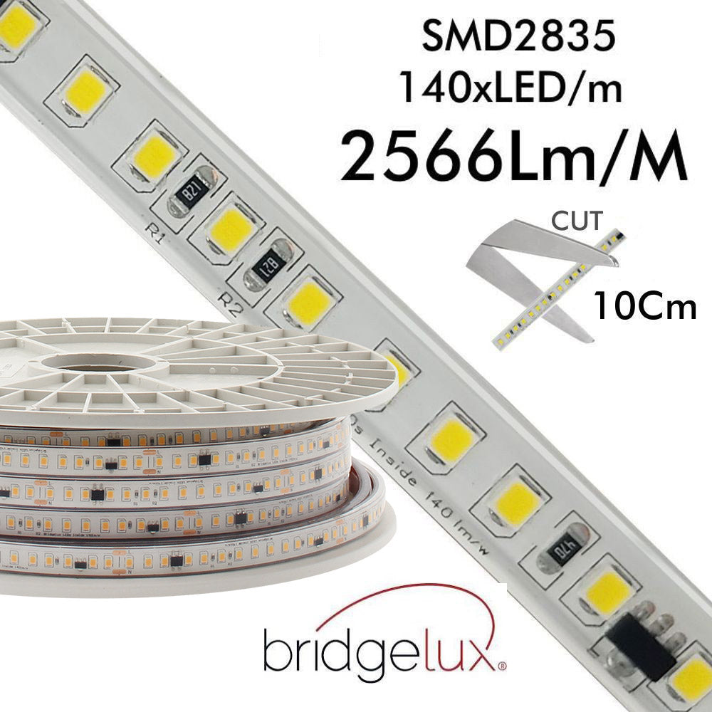 Tira LED 220V Bridgelux SMD2835, 140Led/m, 2566lm/m, Triac regulable, corte 10cm, 1 metro, Blanco cálido 2700K, regulable