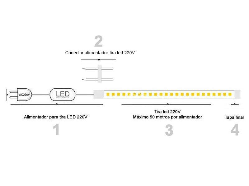 Se pueden suministrar los metros que necesite en una sola tira. Máximo 50 metros. No incluye alimentador ni otros accesorios. Para su uso correcto debe adaptar un alimentador por cada tramo de tira (máximo 50 metros) y sellar el final de la tira con el tapón de PVC.