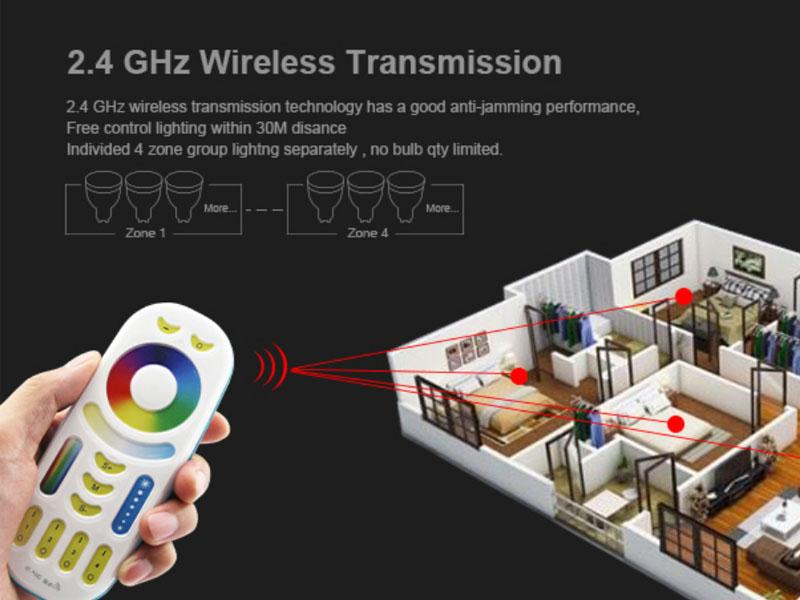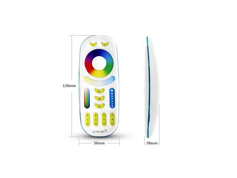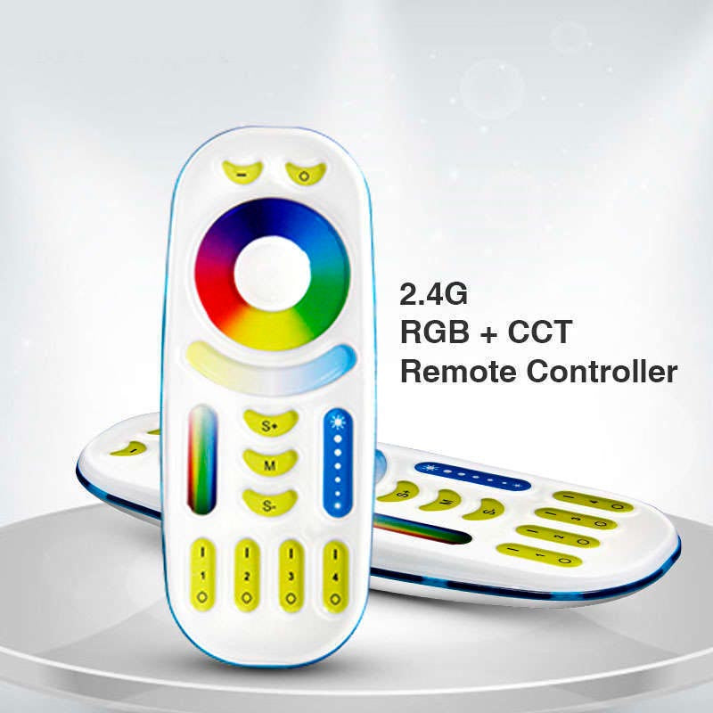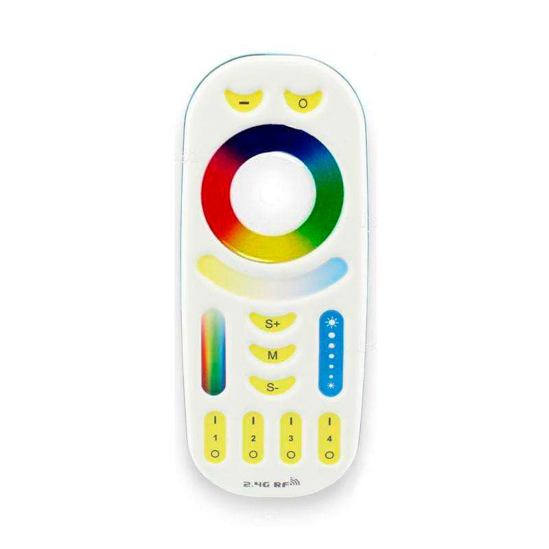 Todo en uno, mando a distancia para un control total de las luminarias, bombillas y tiras led RGB y CCT. Controla el encendido de cuatro zonas diferentes, intensidad y color de luz.