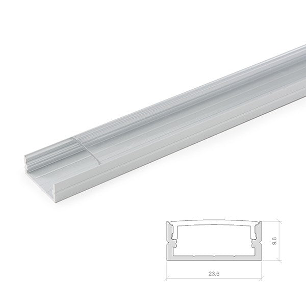 Este perfíl se suministra sin tira de LEDs, con difusor, cuatro clips de sujección y dos tapones finales.