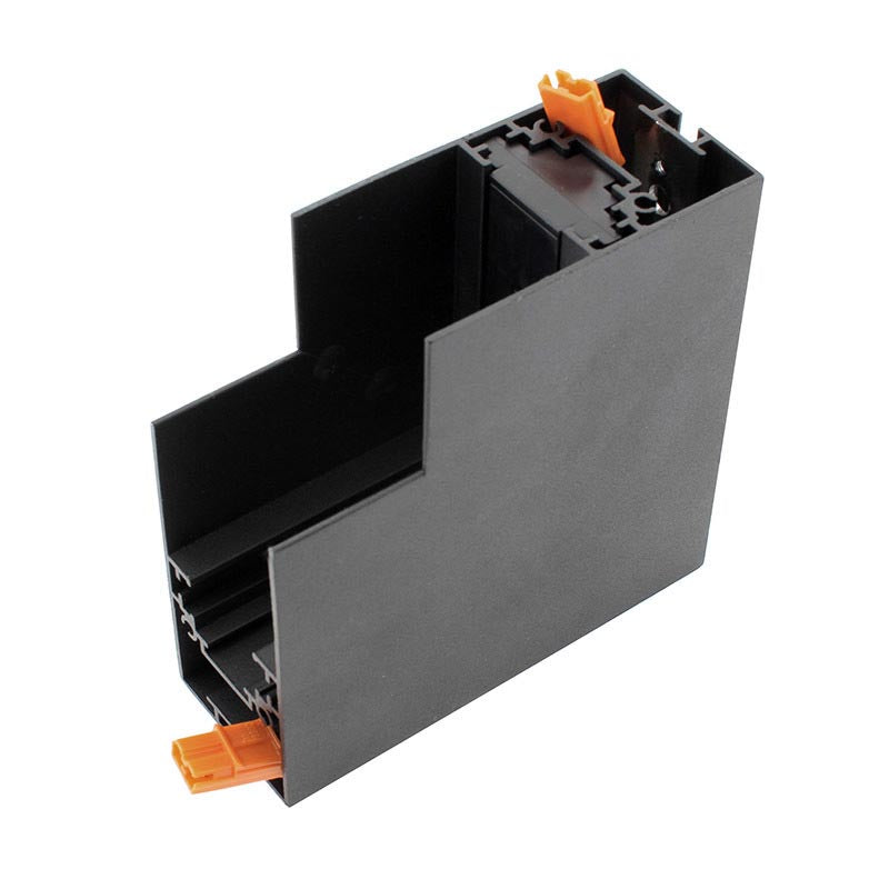 Conector en forma de L para Carril MAGNETIC. Permite conectar dos tramos rectos en distintos planos con un ángulo de 90º. Color negro.