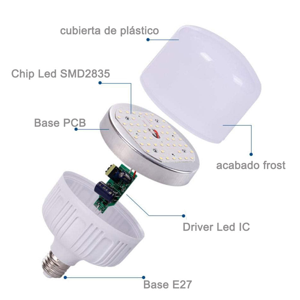 Bombilla LED 40W con cuerpo de plástico y difusor opal diseñada para el alumbrado de amplios espacios.