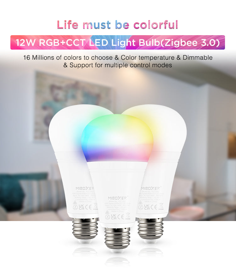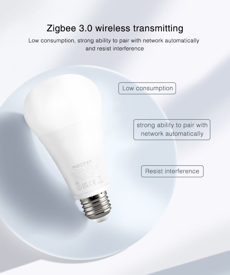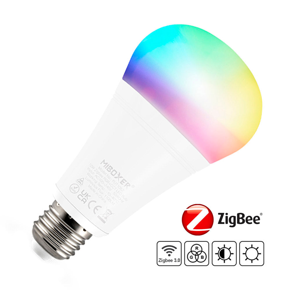 Bombilla inteligente compatible con el standar Zigbee 3.0 que proporciona a los usuarios un control fácil y sencillo de todas sus funiones. Fácil instalación y conectividad ZigBee. Selección entre blanco cálido, neutro o frío, color RGB, o color RGB + blanco.