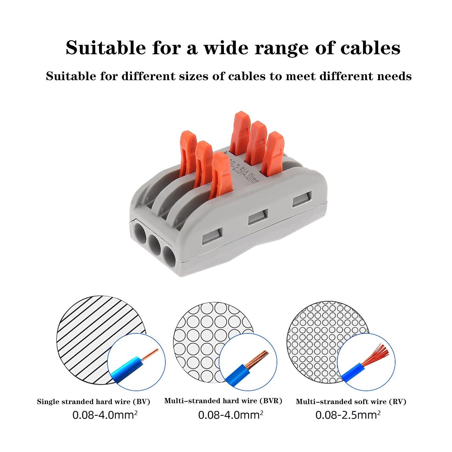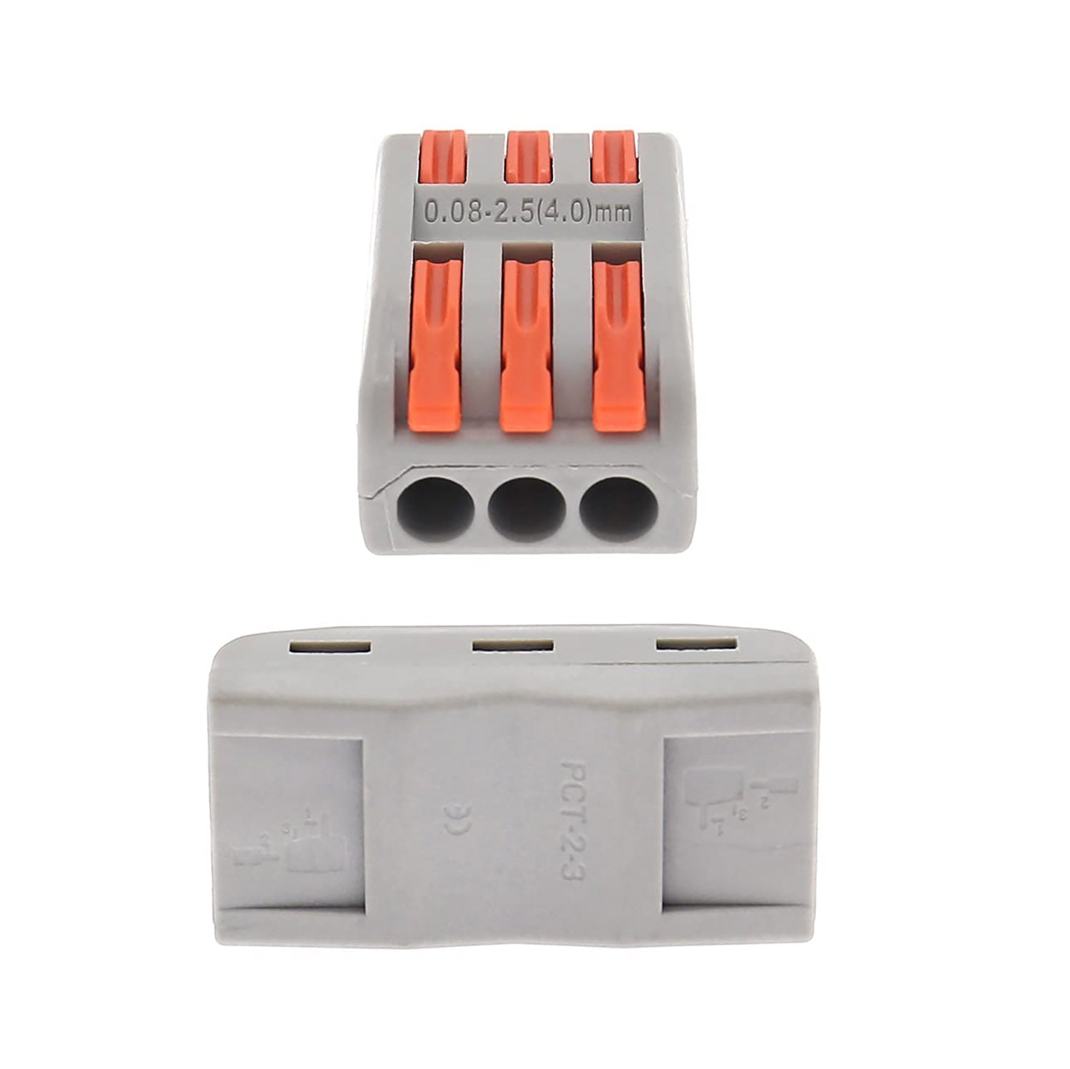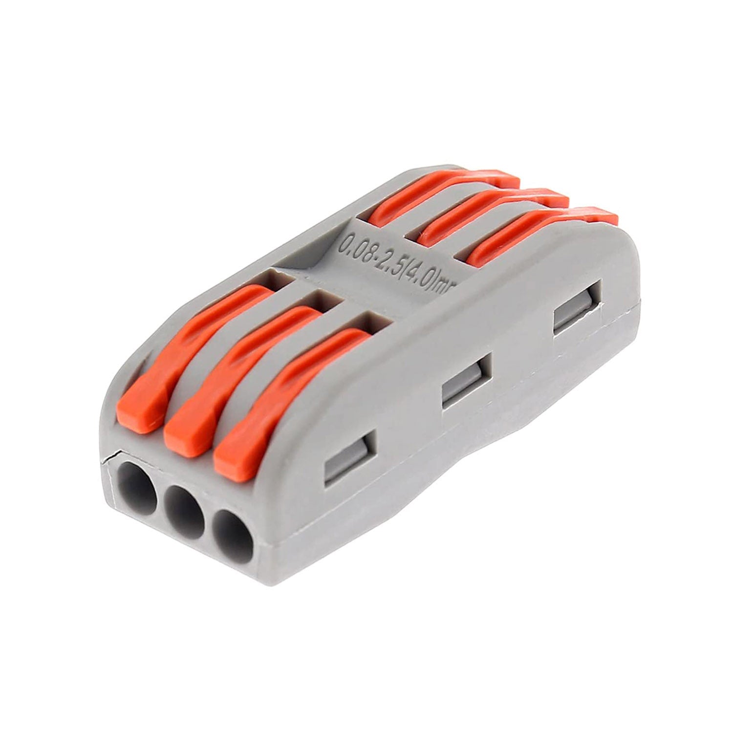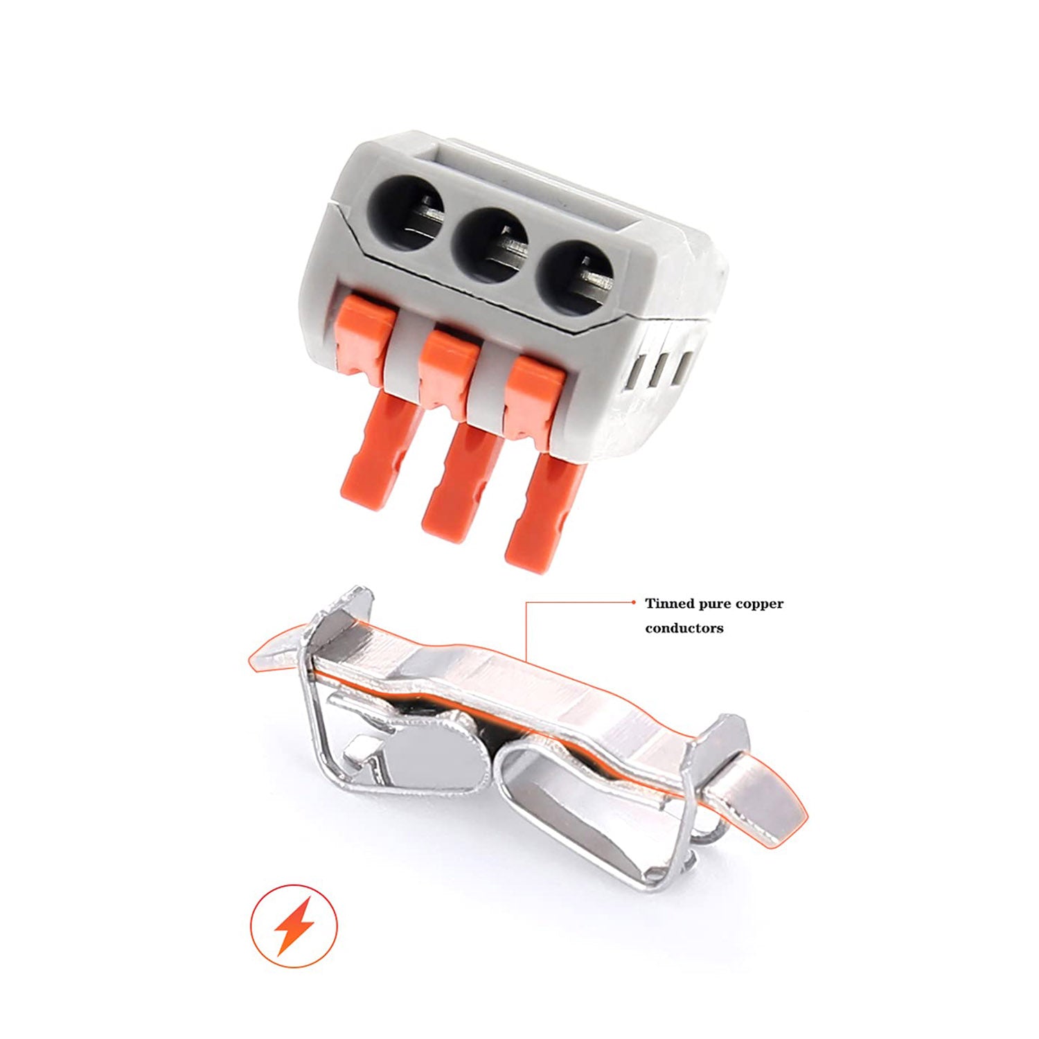 El terminal de conexion WAGO para cables es ideal para realizar la conexión rápida de cables de sección desde 0.8 hasta 2,5 mm2. Conecta cables con seguridad rápidamente mediante los conectores de presión incorporados. Tan fácil como levantar la presilla, introducir el cable y presionar para sujetar el cable.