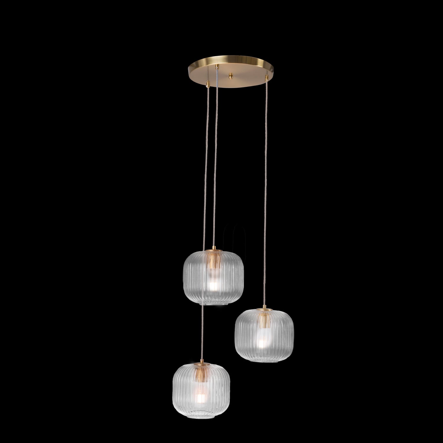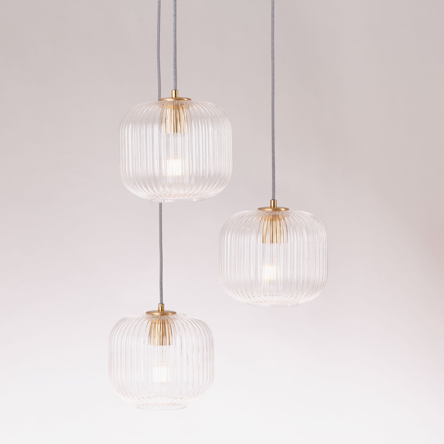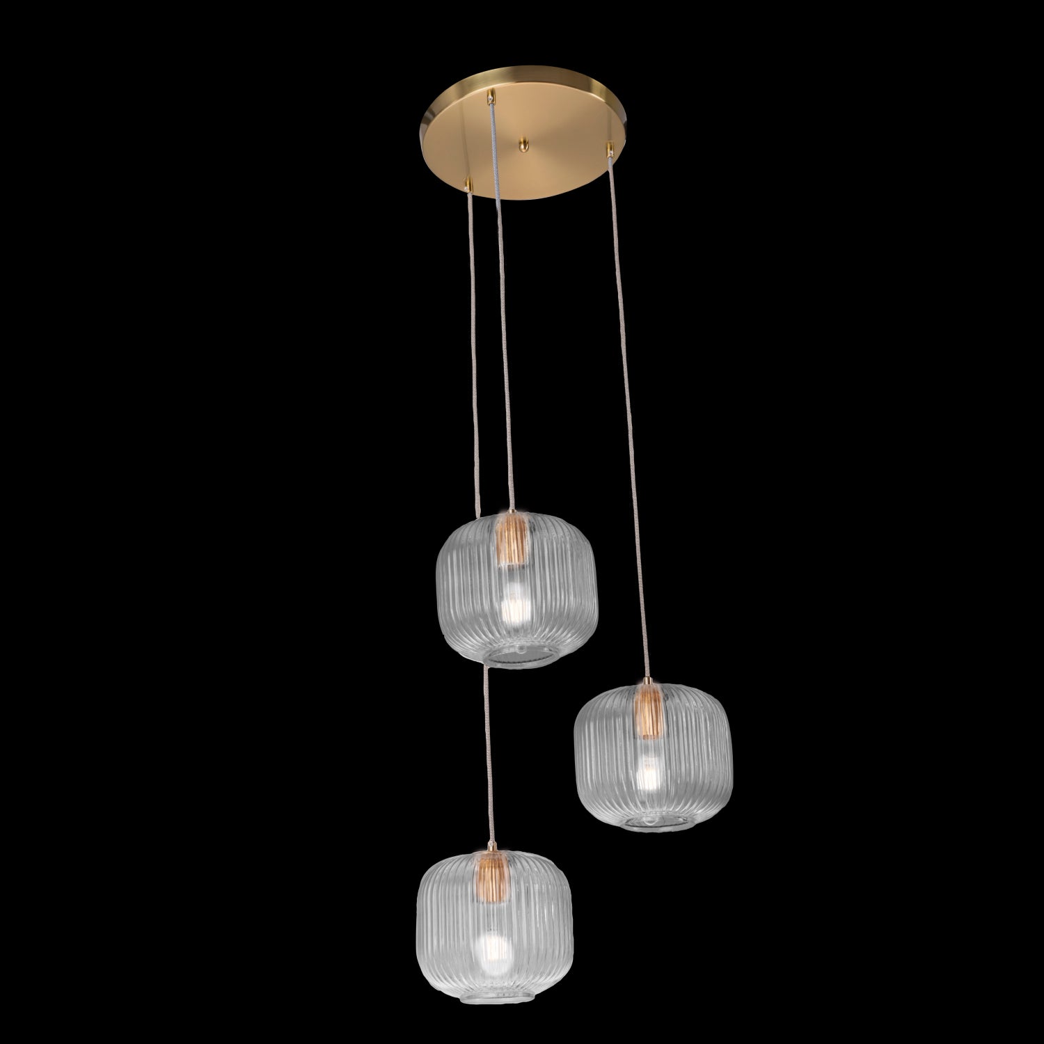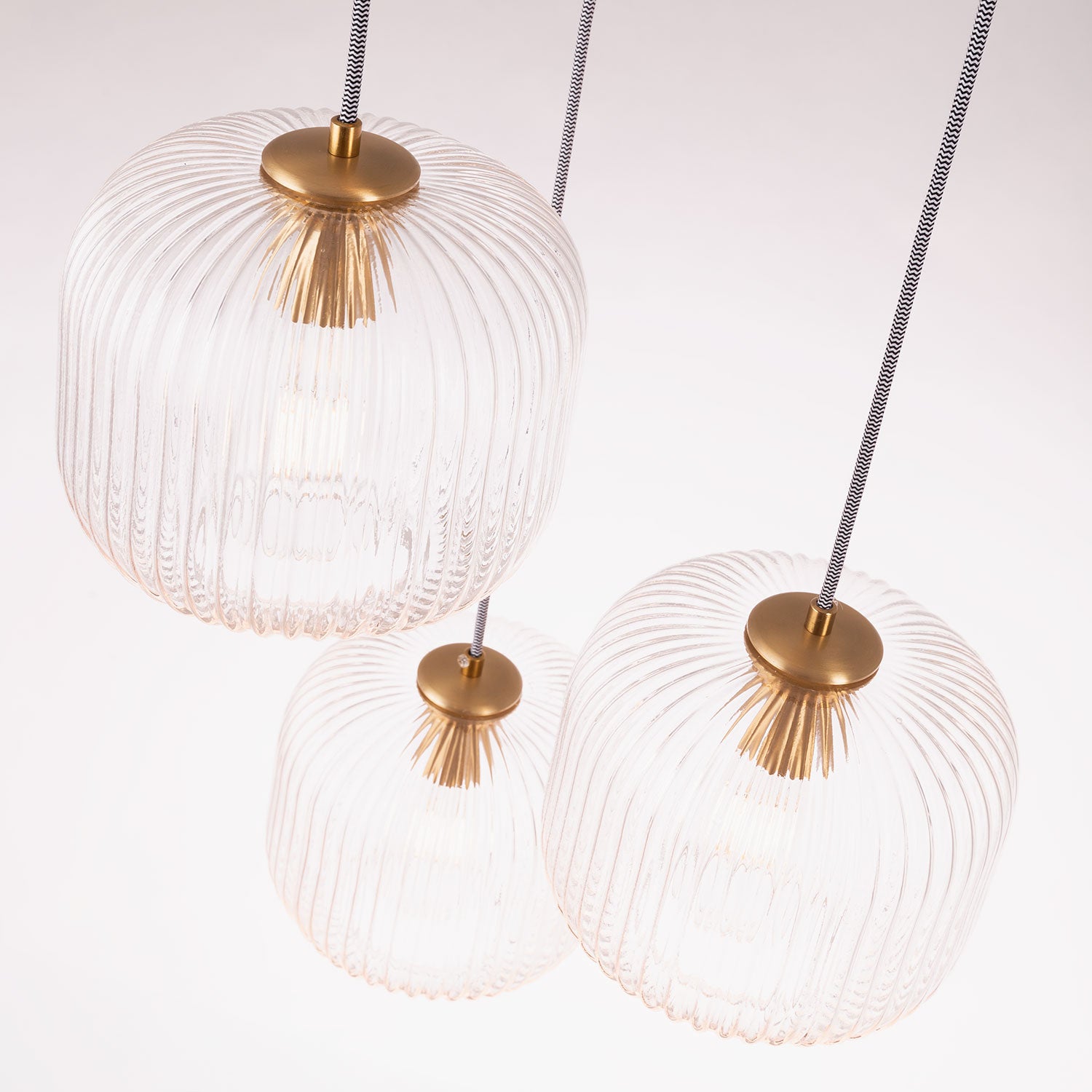 La Lámpara Colgante Cristal Kolpino está fabricada por un florón metálico en acabado dorado y tres pantallas de cristal que cuelgan de tres cables textiles. Sus pantallas hacen que sea su principal característica de diseño, en la elaboración trabaja una forma esférica con sutiles relieves y una combinación de colores vivos como el naranja, gris y beige que rememoran las lámparas clásicas de los años 20.
