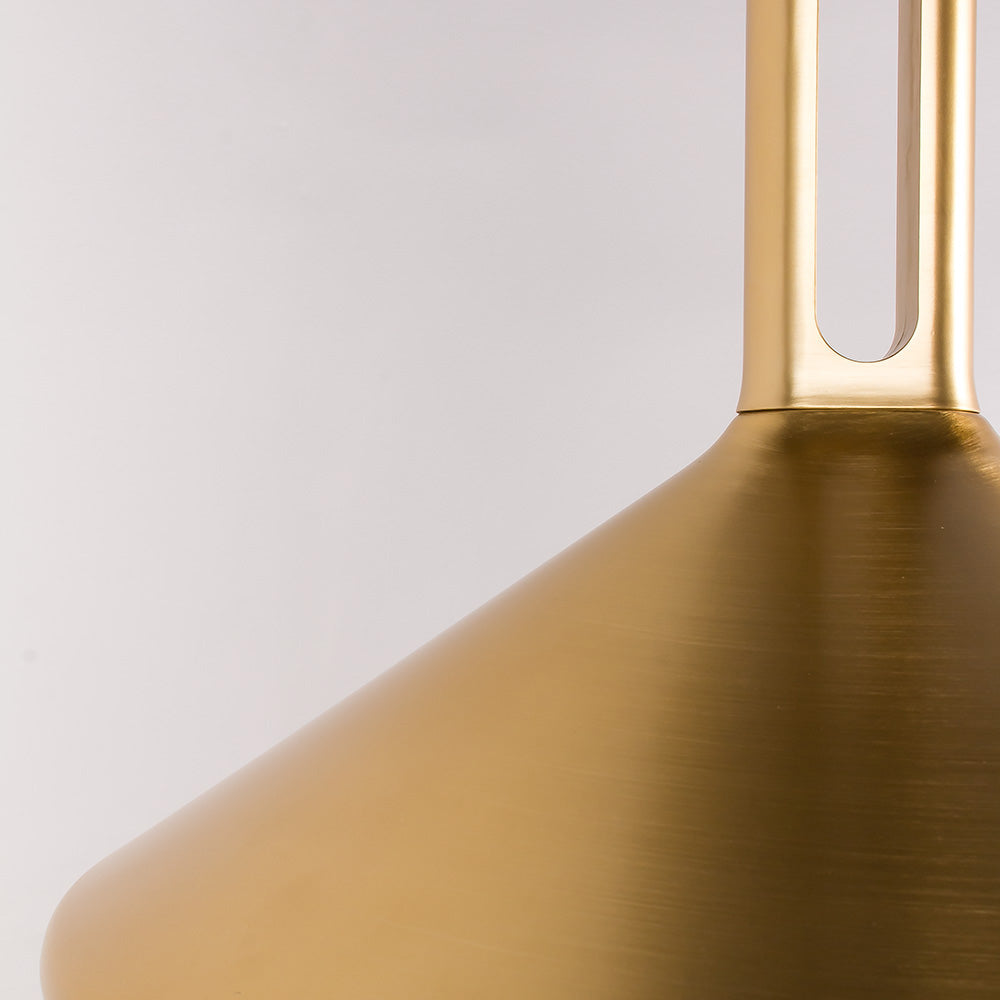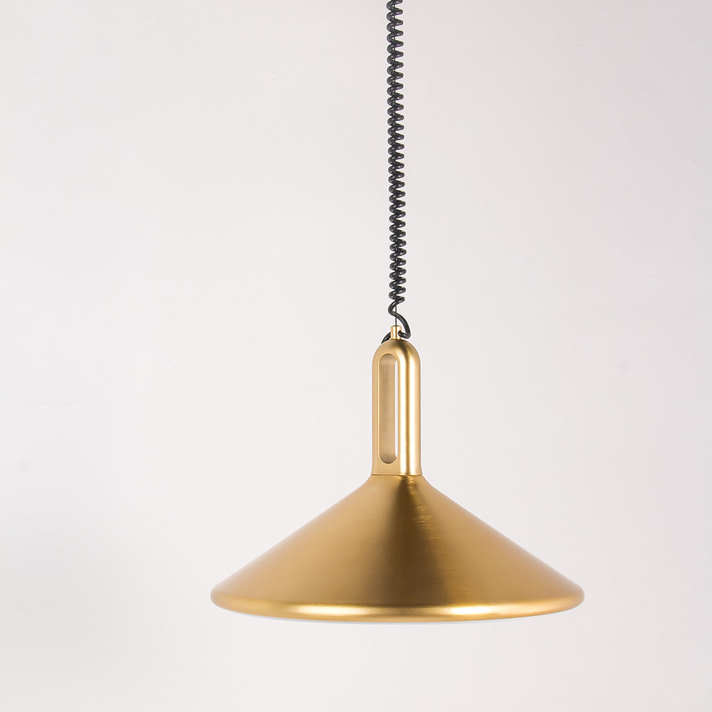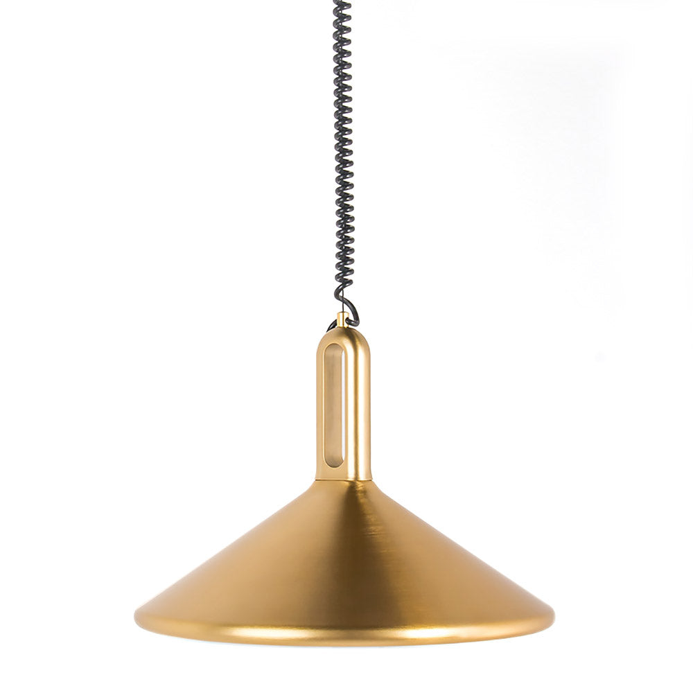 KOLOS es una de lámpara colgante con cuerpo de acero dorado e interior lacado de generosas dimensiones y un sistema de poleas y cable en espiral para regular su altura en cualquier momento de forma cómoda. Un diseño minimalista industrial ideal para crear ambientes de especial belleza en cualquier espacio.
