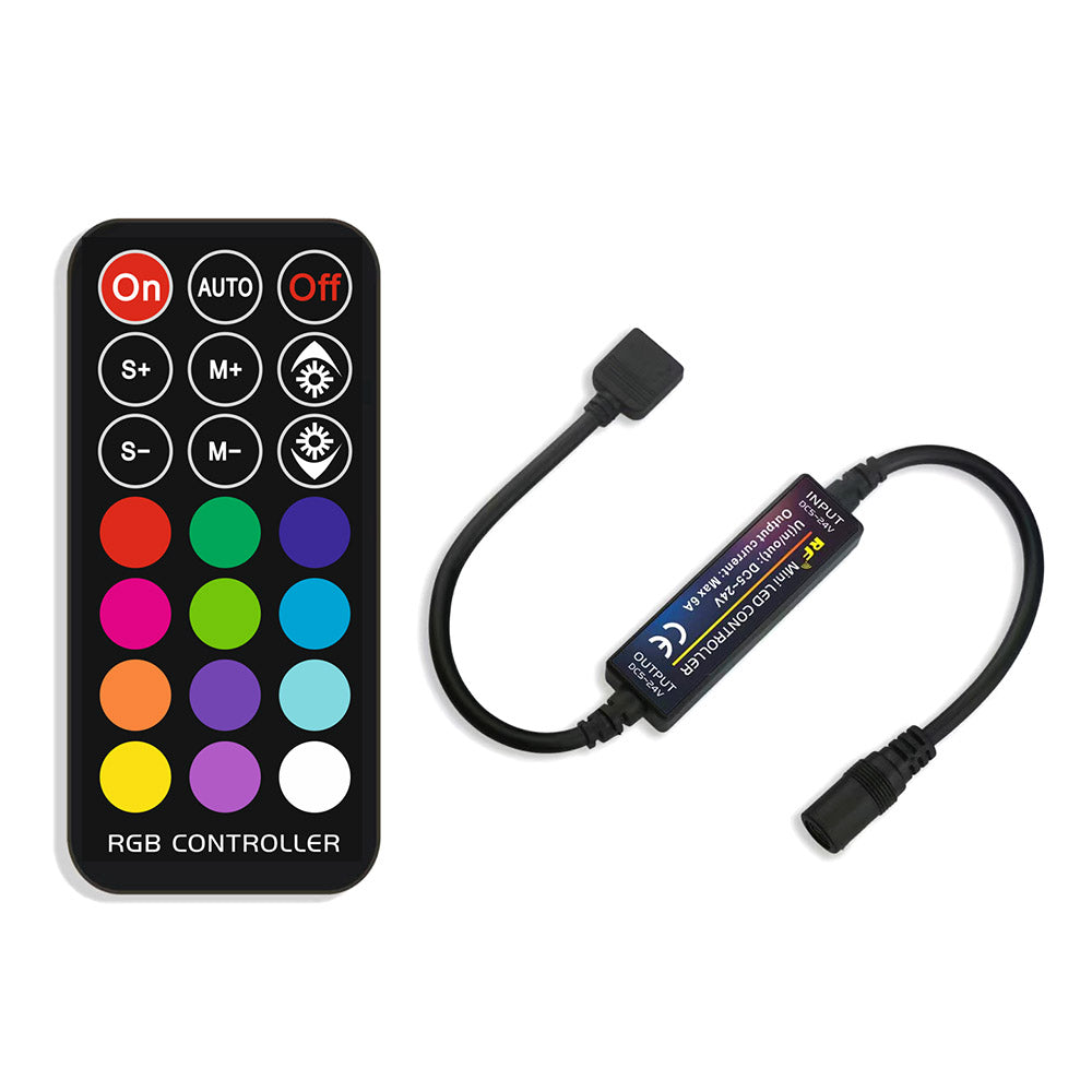 Incluye mando a distancia RF para apagar/encender, color de luz RGB, regular la intensidad y seleccionar los efectos y su configuración.