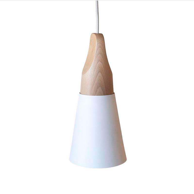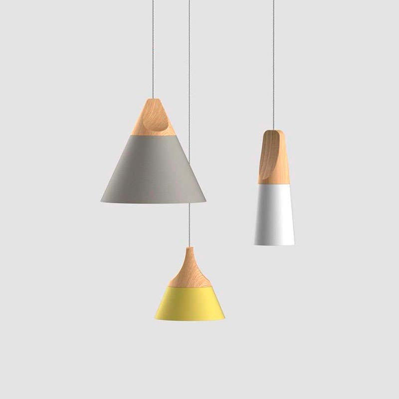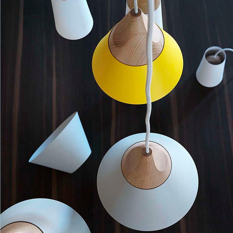 Lámpara colgante para Bombillas LED E27. KONO es una colección de lámparas colgantes, con un cuerpo hecho de madera maciza y una lámina de aluminio de alta calidad y lacado en color para envolver la bombilla que se convierte en un punto esencial de la luz.