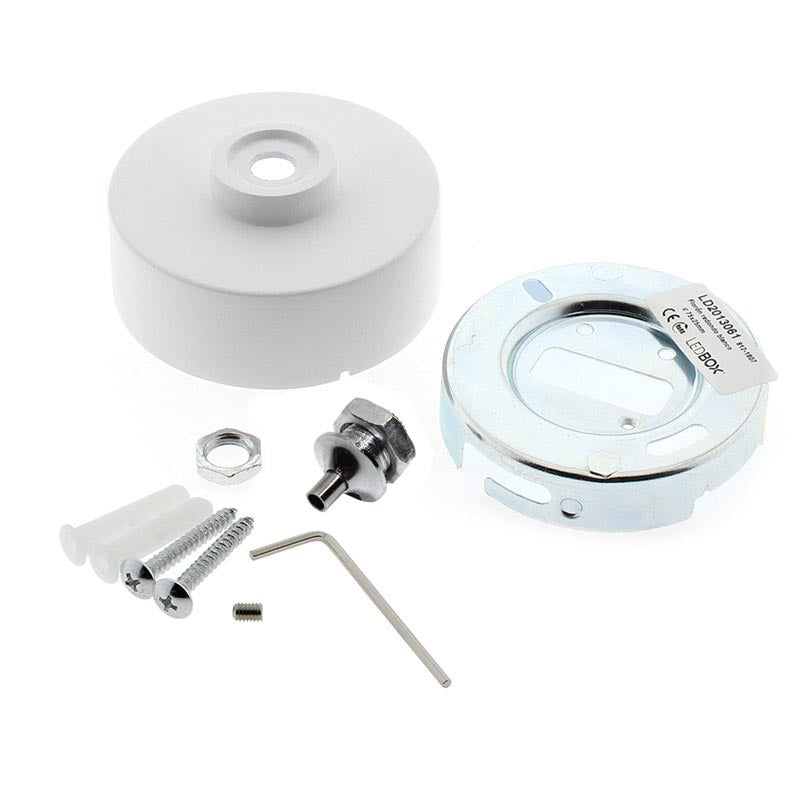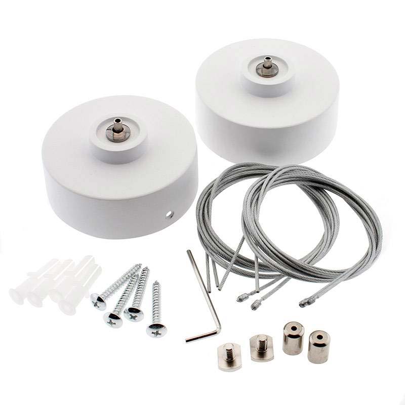 Kit de suspensión que incluye: dos florones redondos de calor blanco Ø75x28mm, dos cables de acero con accesorios de sujección al perfil suspendido y tornillos de sujección a techo.