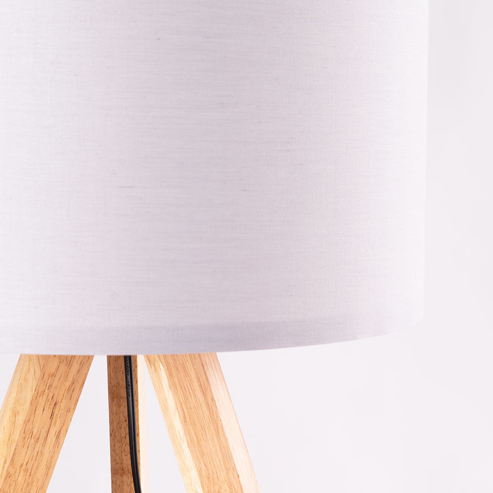Cuenta con un diseño sencillo formado por un armazón de 3 patas de madera de gran calidad y una pantalla o tulipa de tela en forma cilíndrica que permite el paso de la luz, creando un tono acogedor. Es la opción perfecta para ambientar salones, salas de estar o incluso restaurantes. Además, integra un pequeño interruptor para encender y apagar rápidamente sin necesidad de desconectar el conector.