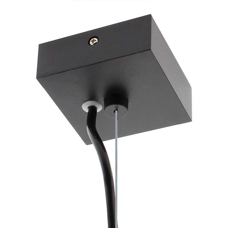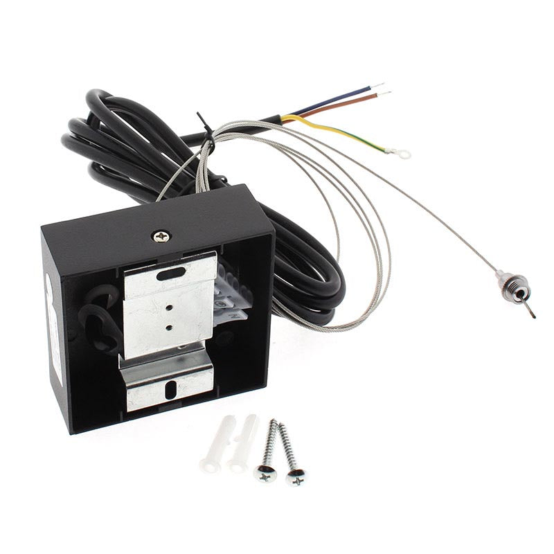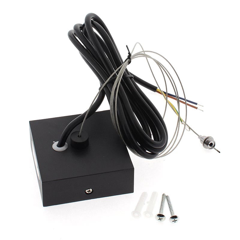 Kit de suspensión que incluye: Florón cuadrado negro de 80x80x30mm, cable redondo de 3 hilos de 0.75mm y 1.5m de longitud. Cable de acero de suspensión con pasador sujetables, clip de conexión rápida de cables y tornillos de sujección.