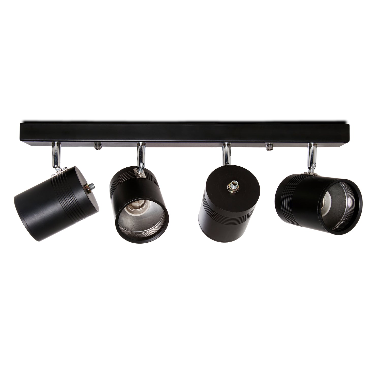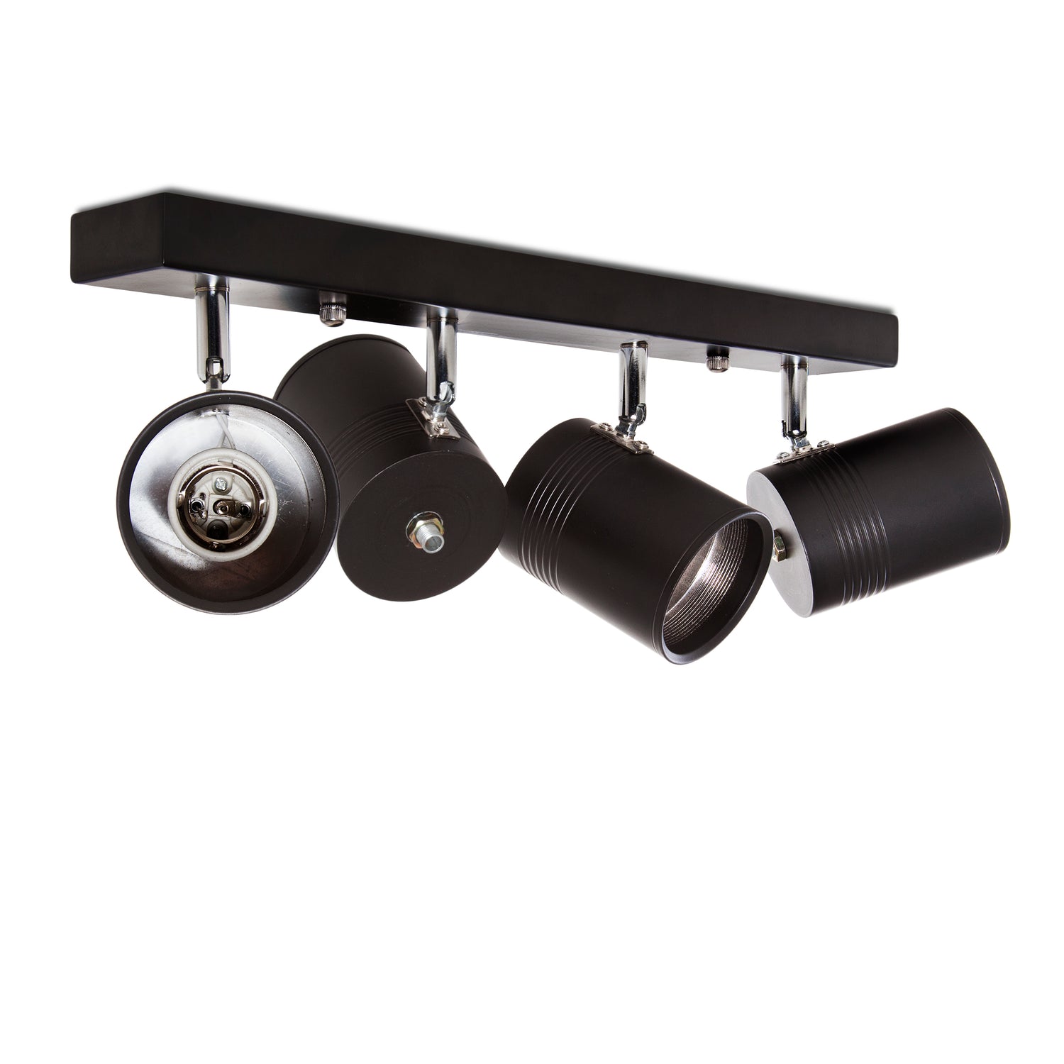 Adicionalmente, es lo suficientemente robusto para las exigencias mecánicas requeridas. Tiene un acabado negro construido con aluminio.Este Foco de techo está diseñado para emplear cuatro bombillas de LEDs con casquillo E27. Tiene una longitud de 460mm y cada foco mide 96mm con un diámetro de 75mm.