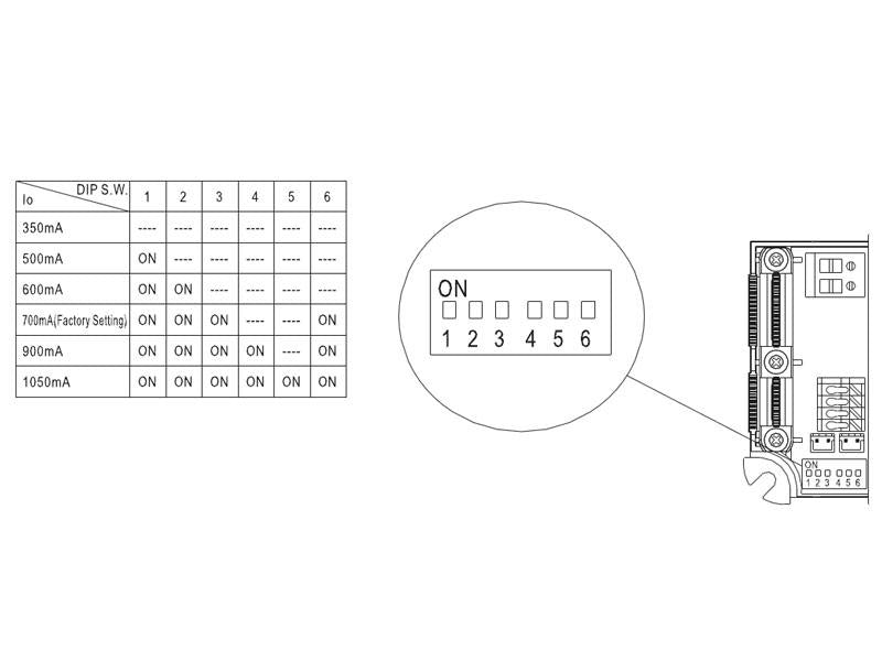 El DRIVER Mean Well LCM permite el ajuste de voltaje y corriente con múltiples valores 350mA/500mA/600mA/700mA/900mA/1050mA mediante la combinación de los dip switch incorporados en el driver.