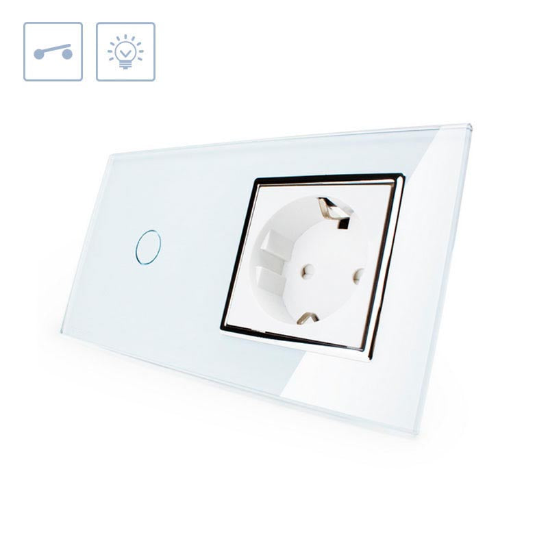 Conmutador doble de 2 cuerpos con 1 encendido + 1 enchufe en color blanco con función de control remoto (vía RF). Interruptor eléctrico de empotrar con cuerpo de aluminio y panel frontal táctil iluminado de cristal templado con acabado de alta calidad y diseño minimalista. Incluye marco interior del color del cristal.