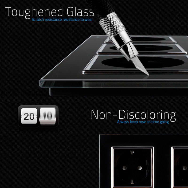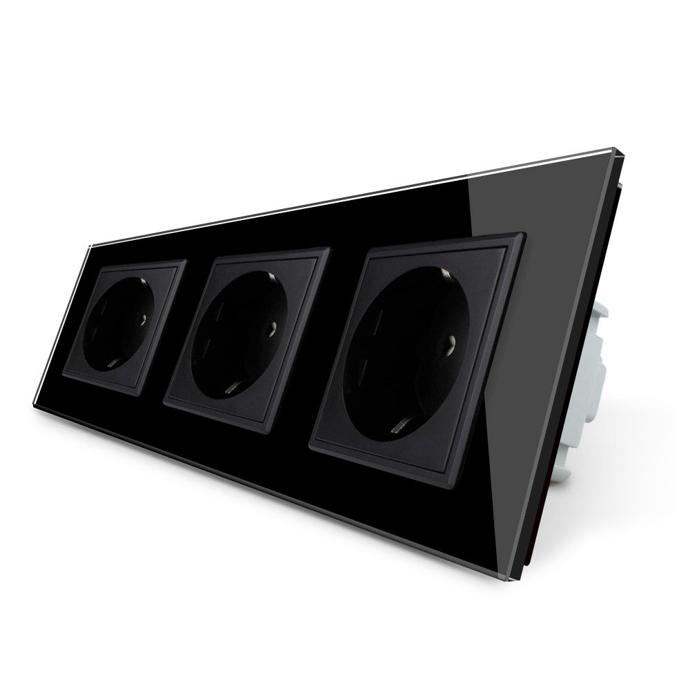 Enchufe triple tipo SCHUKO EU de 16A negro, compuesto de mecanismo (base) + clavija plástico + panel frontal vidrio. Mecanismo eléctrico de empotrar con cuerpo de aluminio y panel frontal de cristal templado con acabado de alta calidad y diseño minimalista. Incluye marco interior del color del frontal.