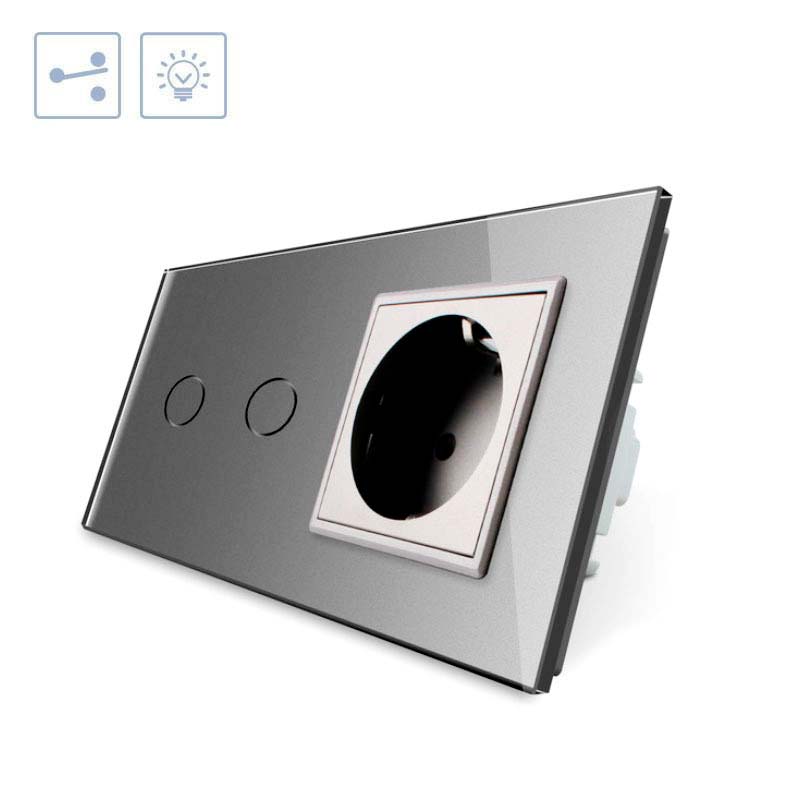 Conmutador táctil, 2 botones + 1 enchufe, frontal gris