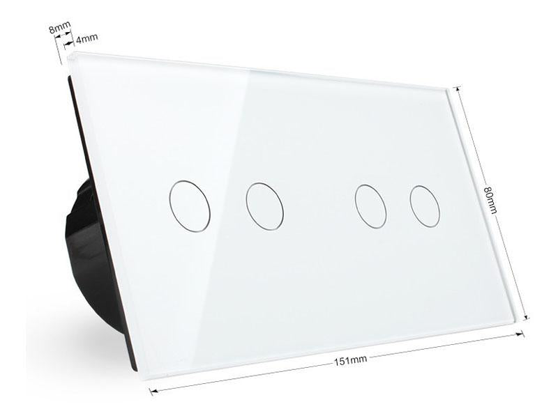 Conmutador doble de 2 cuerpos con 4 encendidos en color blanco con función de control remoto (vía RF). Conmutador eléctrico de empotrar con cuerpo de aluminio y panel frontal táctil iluminado de cristal templado con acabado de alta calidad y diseño minimalista.