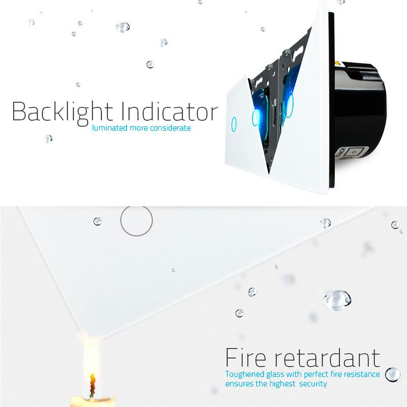 Todos los mecanismos eléctricos disponen de alta resistencia al fuego gracias a su panel frontal hecho de vidrio templado que aporta gran seguridad y al a vez están protegidos contra la humedad gracias al panel frontal de vidrio totalmente impermeable.