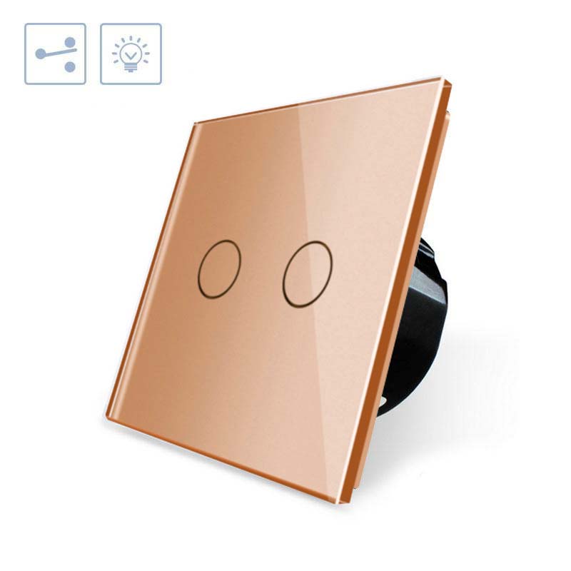 Conmutador sencillo de 1 cuerpo con 2 encendidos en color golden. Conmutador eléctrico de empotrar con cuerpo de aluminio y panel frontal táctil iluminado de cristal templado con acabado de alta calidad y diseño minimalista.