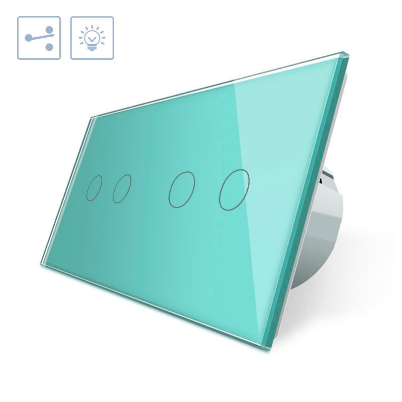Conmutador doble de 2 cuerpos con 4 encendidos en color verde. Conmutador eléctrico de empotrar con cuerpo de aluminio y panel frontal táctil iluminado de cristal templado con acabado de alta calidad y diseño minimalista.