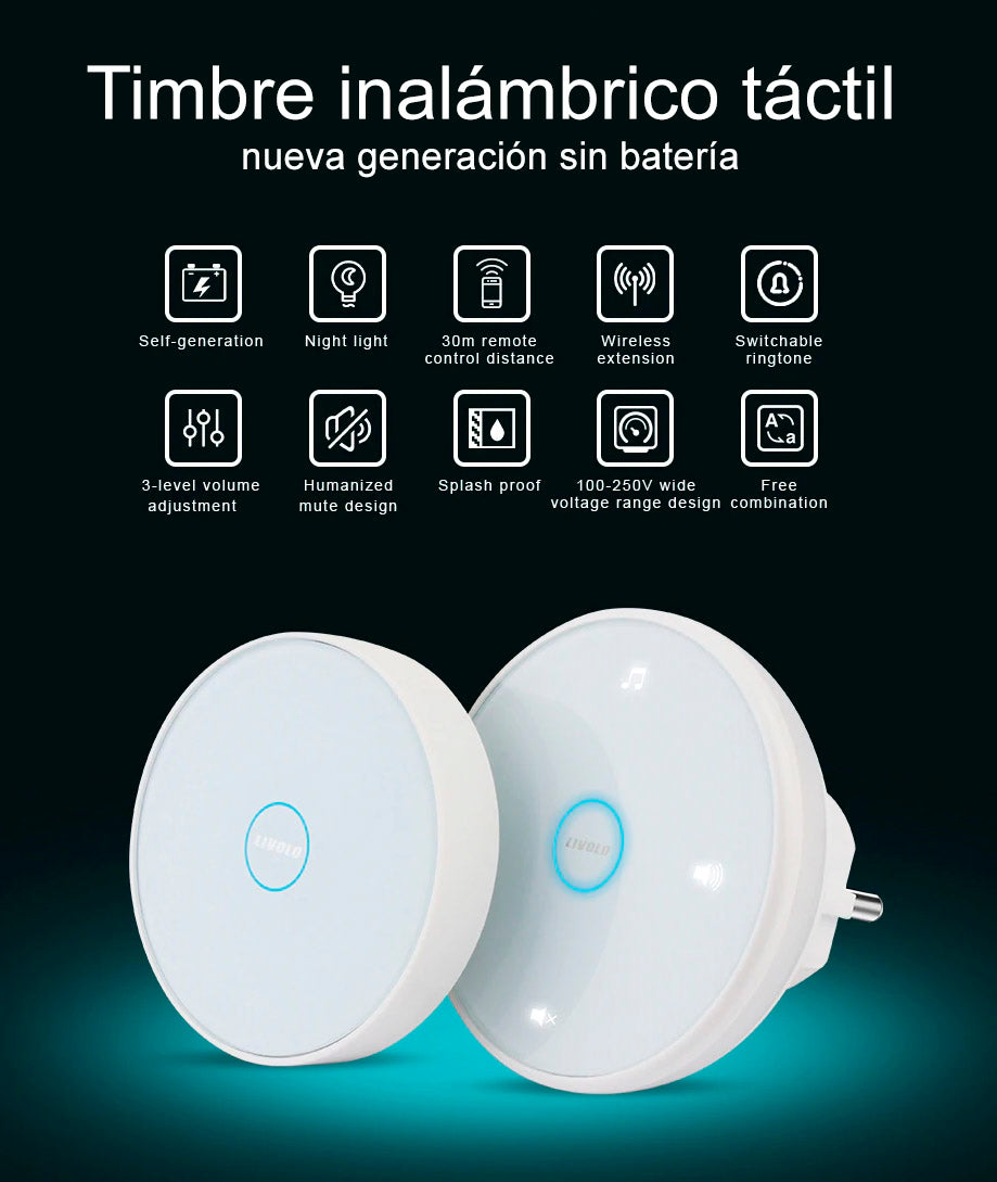 Emisor de timbre inalámbrico sin batería. Transmite señal RF al receptor (no incluido) para su intalación en cualquier lugar sin necesidad de cableado. Fácilmente configurable y con un diseño minimalista.