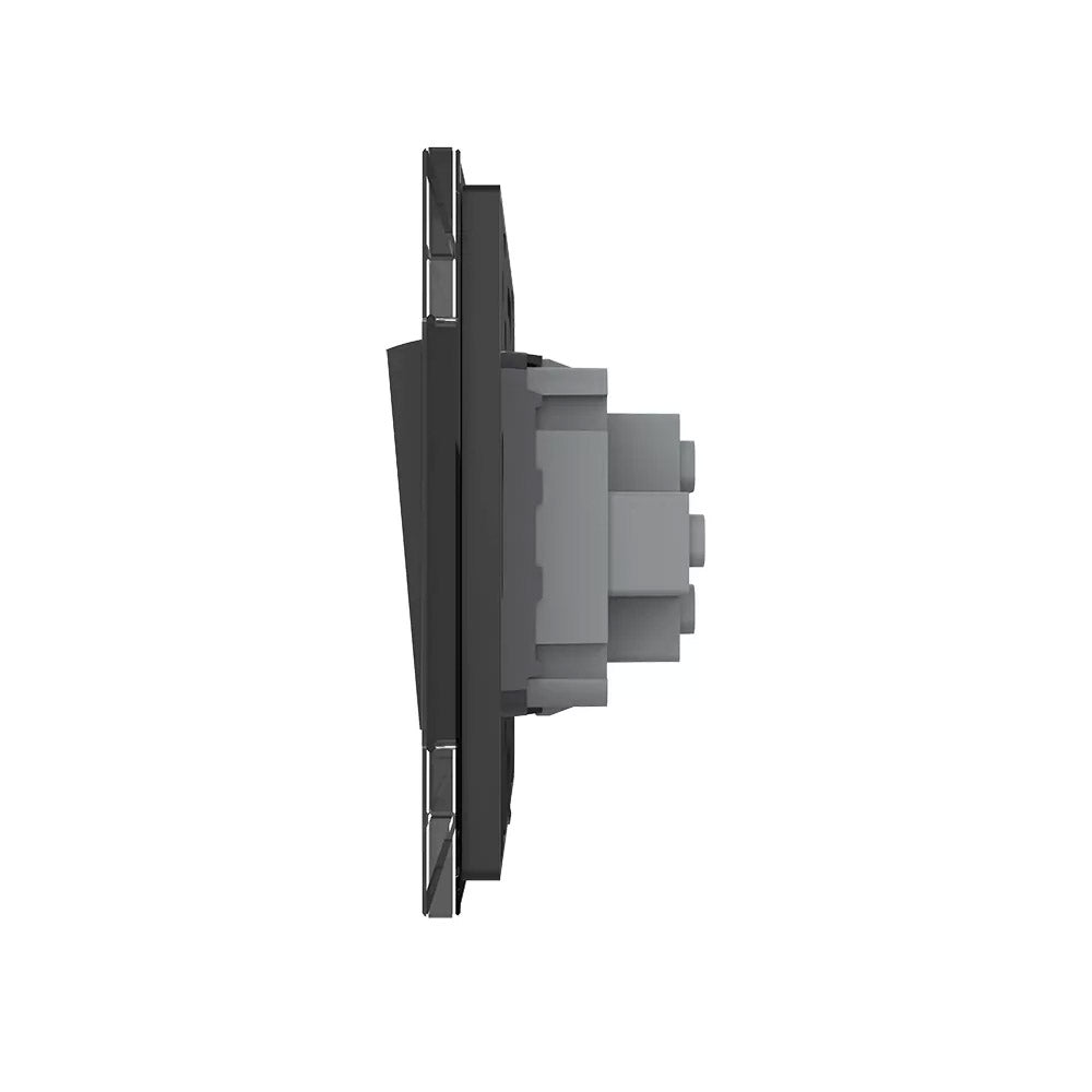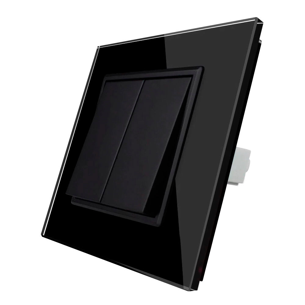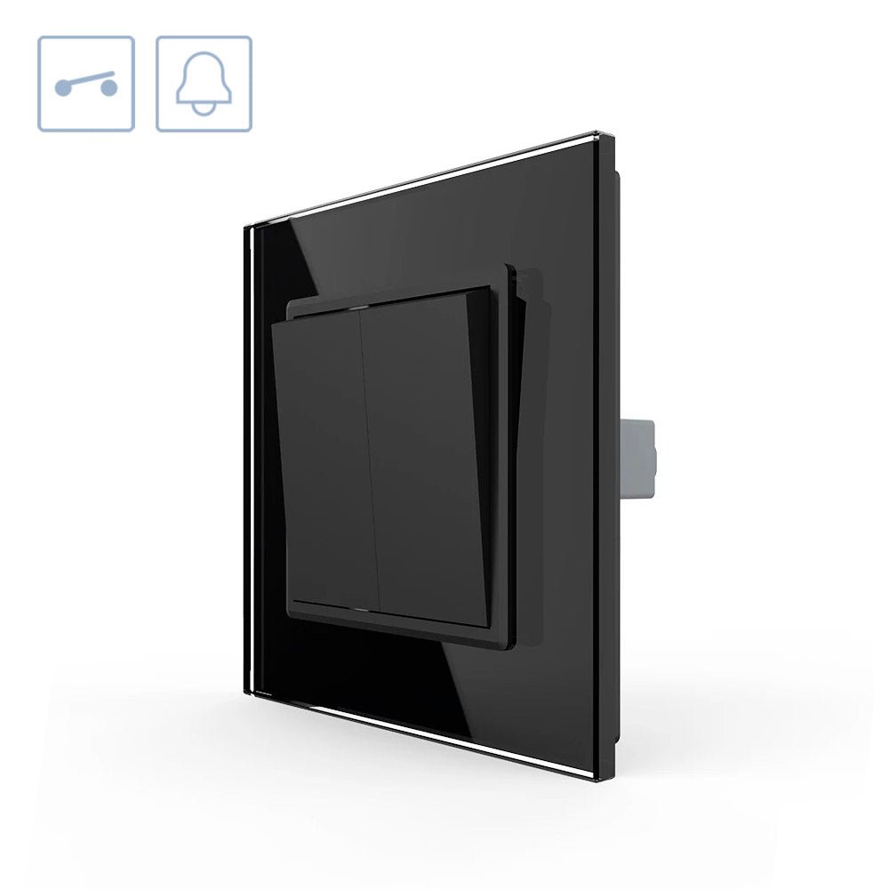 Mecanismo de empotrar EU, pulsador. Con teclas y marco de cristal de color negro. Incluye 2 interruptores/conmutadores de media tecla, marco metálico y panel frontal de cristal.