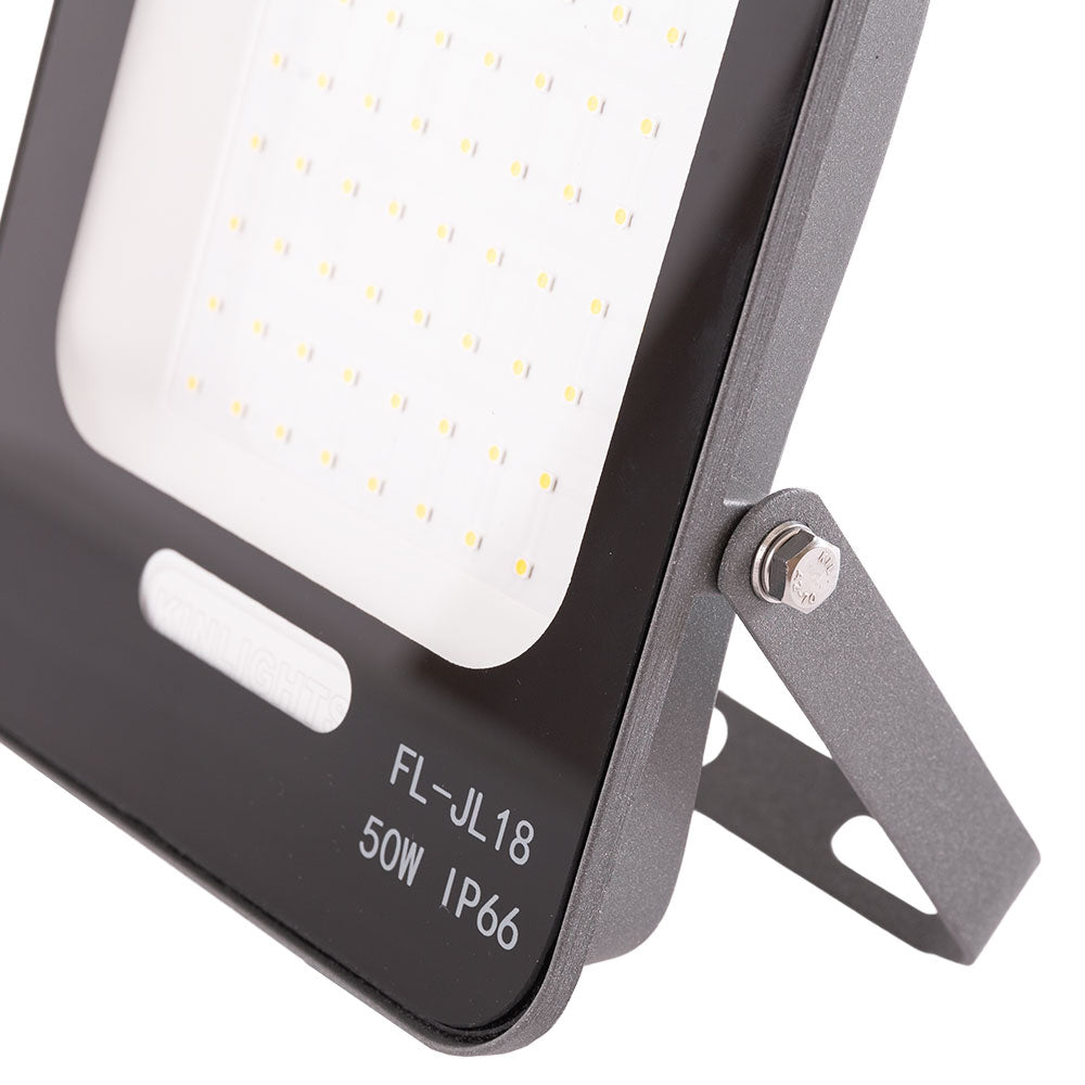 Cuenta con 50W de potencia, alimentación de 100-277VAC, un factor de potencia 0.99 y óptica SMD. Su grado de protección IP65 lo hace ideal para exteriores. Su índice de reproducción cromática (CRI) es Ra>80 y tiene una vida útil estimada de 50.000 horas.