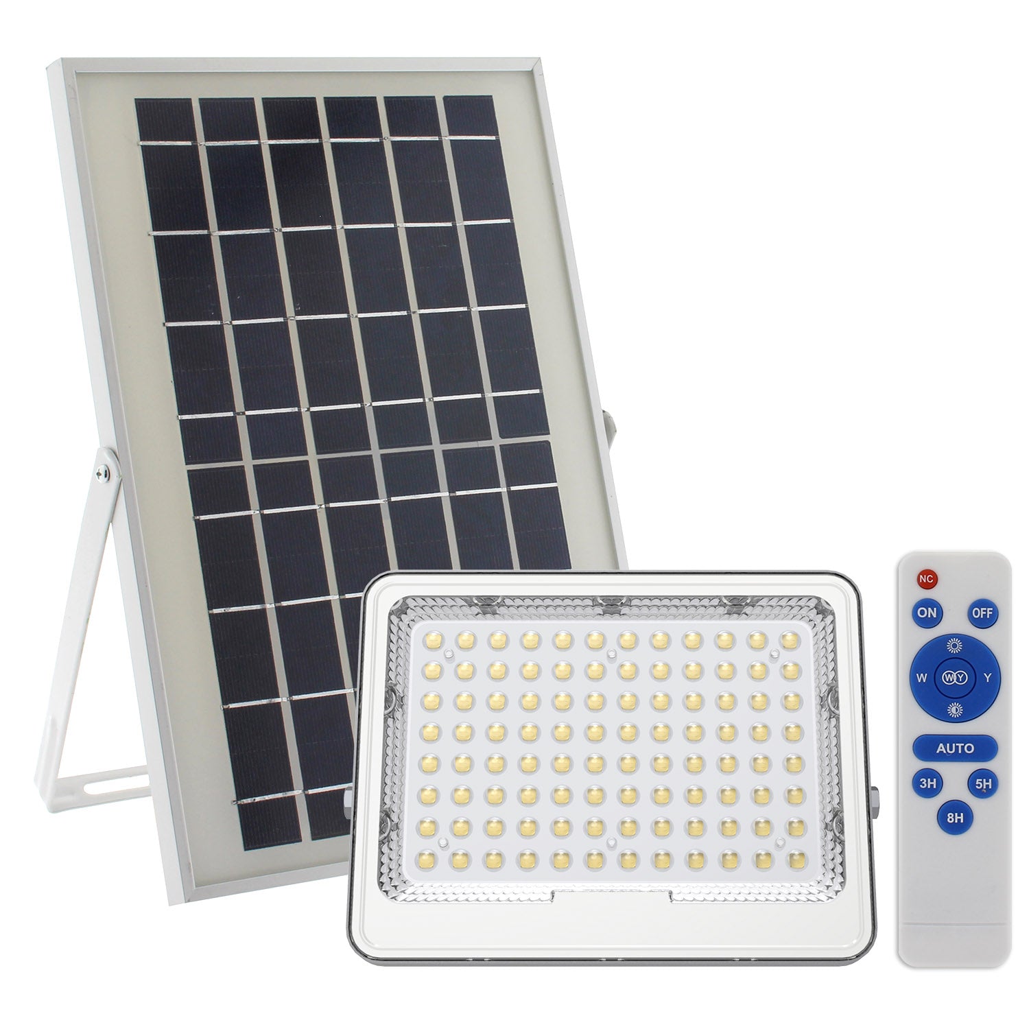 Kit que incluye proyector solar LED con batería de litio integrada de alta potencia, panel solar, mando a distacia y herrajes para su instalación. Incorpora sensores de luminosidad. Ideal para iluminar de manera automatizada y sin necesidad de corriente eléctrica cualquier zona de exterior.