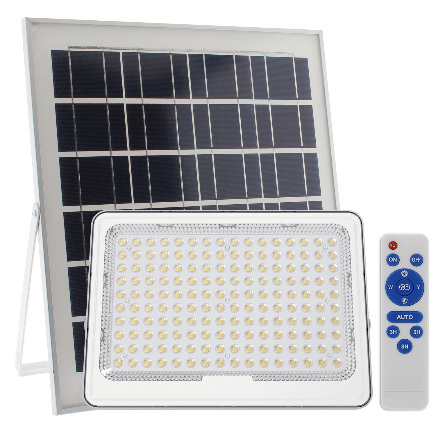 Kit que incluye proyector solar LED con batería de litio integrada de alta potencia, panel solar, mando a distancia y herrajes para su instalación. Incorpora sensores de luminosidad. Ideal para iluminar de manera automatizada y sin necesidad de corriente eléctrica cualquier zona de exterior.