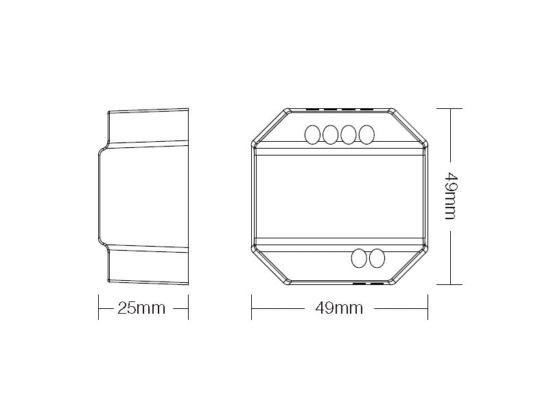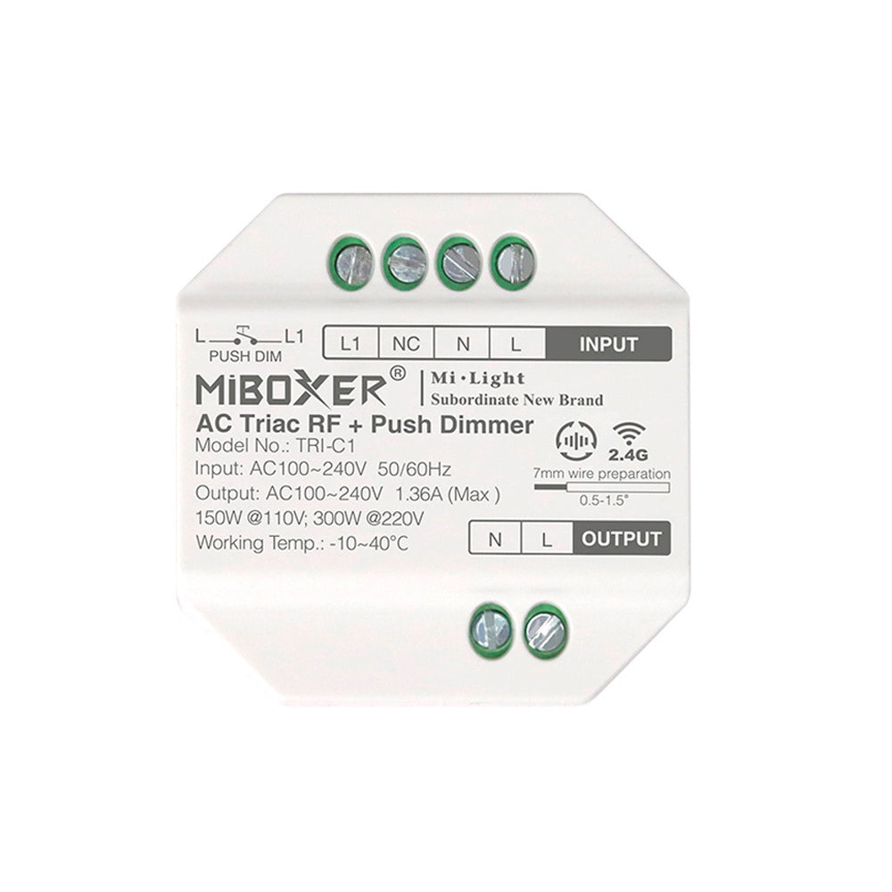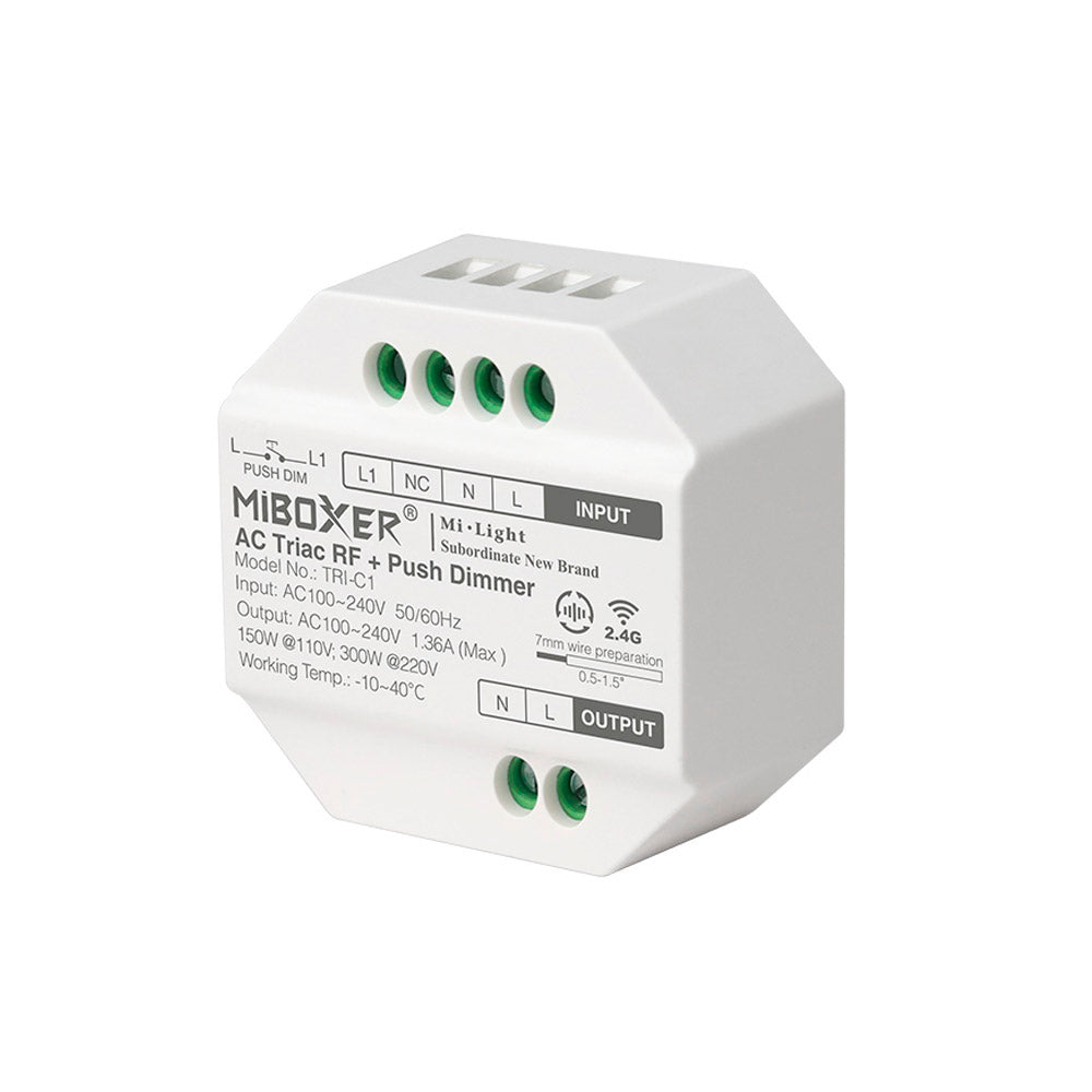 Un nuevo concepto de regulador TRIAC AC (max 300W) de mínimo tamaño y compatible con mandos a distancia RF (ver accesorios) para el control de luminarias LED regulables, lámparas incandescentes y halógenos.