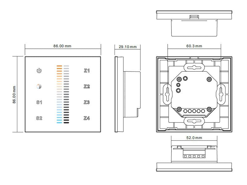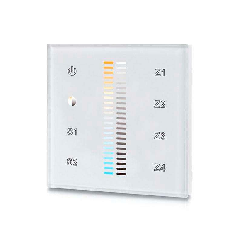 Controlador de pared con pantalla de cristal táctil de gran precisión para un control profesional de tiras led blanco dual. Compatible con los receptores de la serie LB1009