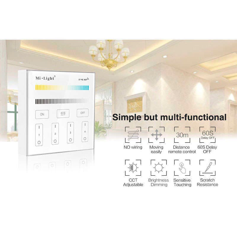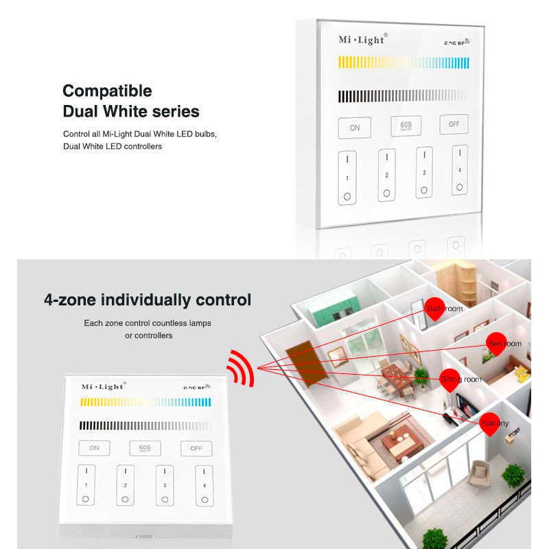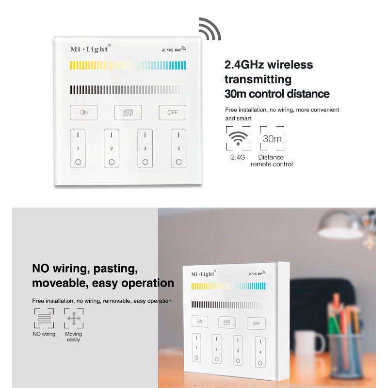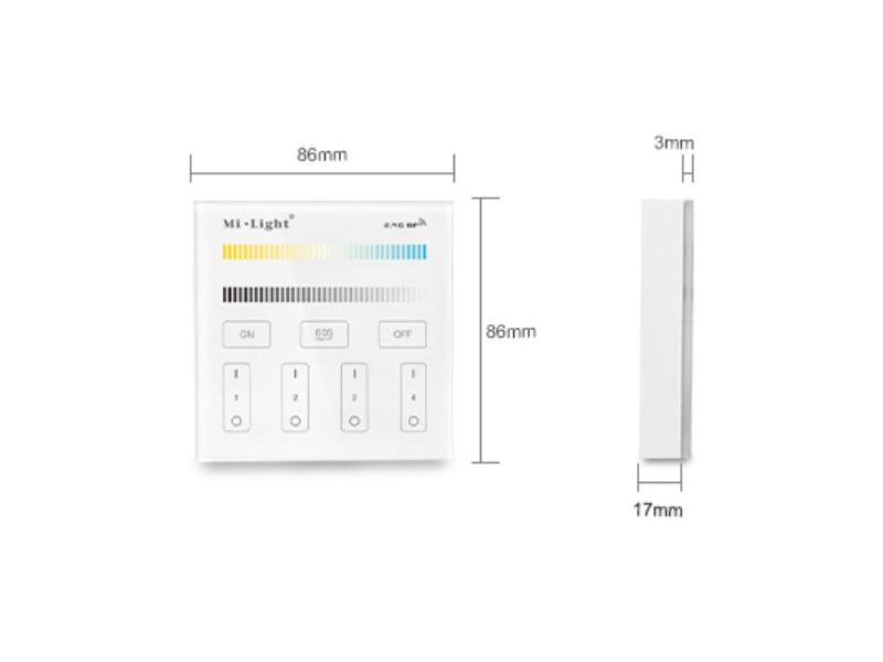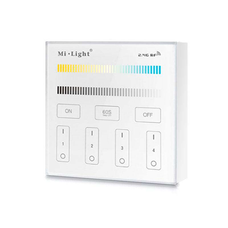 Control remoto de pared con pantalla de cristal táctil de gran precisión para un control profesional de tiras led blanco dual CCT. Permite el control de 4 zonas. Se alimenta con 2 pilas tipo AAA y es posible ponerlo en cualquier superfice sin necesidad de empotrarlo.