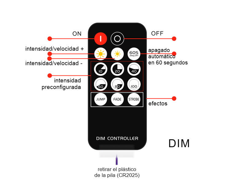 Incluye: controlador y mando a distancia RF (incluye pila 3V tipo botón)