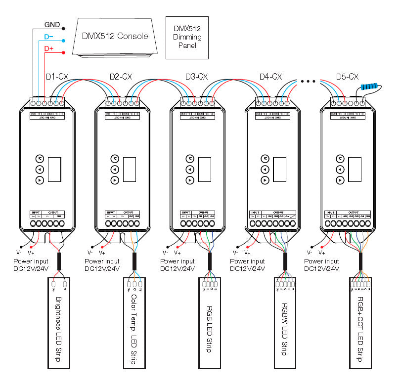 - Posibilidad de ampliar la instalación añadiendo múltiples decoder DMX512