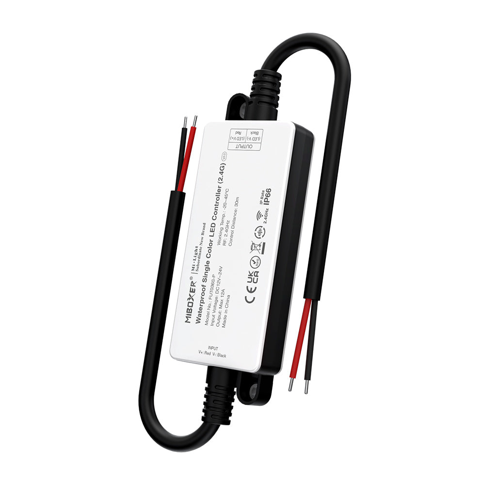 Control profesional con protección IP66 para cualquier tipo de tira led monocolor. Con autosincronización, transmite los comandos recibidos al resto de controladores a su alcance (30m) aumentando significativamente la distancia de la instalación.