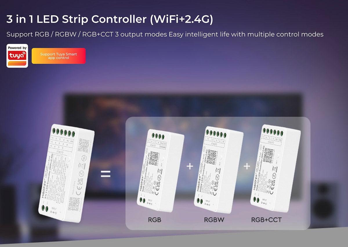 Controlador 3 en 1, controla tiras RGB / RGBW o RGB+CCT con el mismo controlador con conectividad WIFI y 2.4G RF.