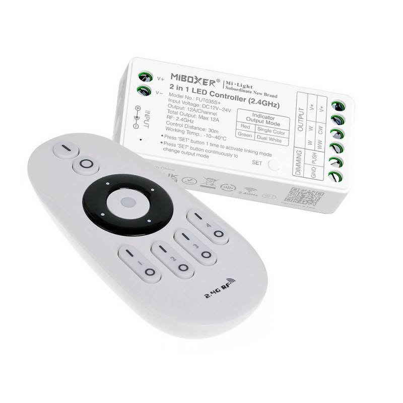 Kit que incluye Controlador RF 2.4Ghz para tiras led monocolor y CCT + mando a distancia. Puede realizar el control de cuatro zonas diferentes y realizar los grupos y combinaciones que se requieran. Funciona a través de un receptor de RF que dispone de un radio de acción de 30 metros.