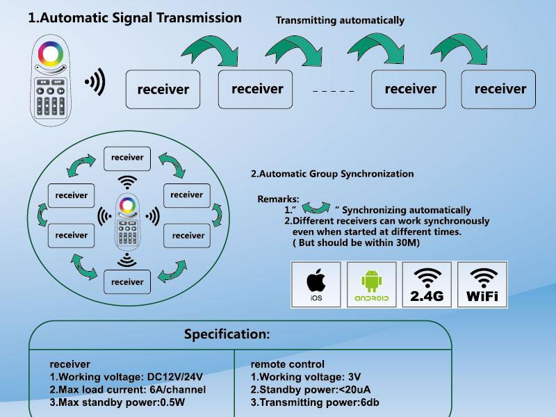 Su función de sincronización permite que con un solo mando a distancia pueda manejar uno o varios controladores (configurable por el usuario). Con selector de color mediante rueda táctil que permite elegir entre multitud de opciones de color, modo blanco puro o neutro ó 19 modos dinámicos predefinidos. Control de velocidad en las transiciones, de brillo y controles ON / OFF. La intensidad máxima soportada es de 6 amperios por canal, 18 A en total. Para ser utilizado con un smartphone o tablet con Android o iOS mediante aplicación gratuita App, debe ser emparejado con el Controlador HUB Wi-Fi (opcinal, se vende por separado) para ajustar todas las funciones.