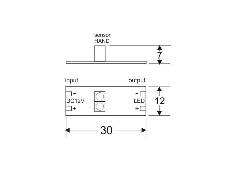 Sensor IR de reducido tamaño (30X12mm)para instalar en un perfil que se conecta directamente a la tira led monocolor y permite encenderla automáticamente cuando detecta movimiento (5-10cm)