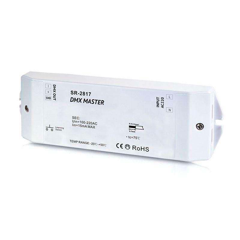 Master profesional DMX que trabaja como receptor de señal RF y convierte a señal DMX512 estándar para controlar luminarias led con entrada DMX tiras MONO o RGB, proyectores lineales...